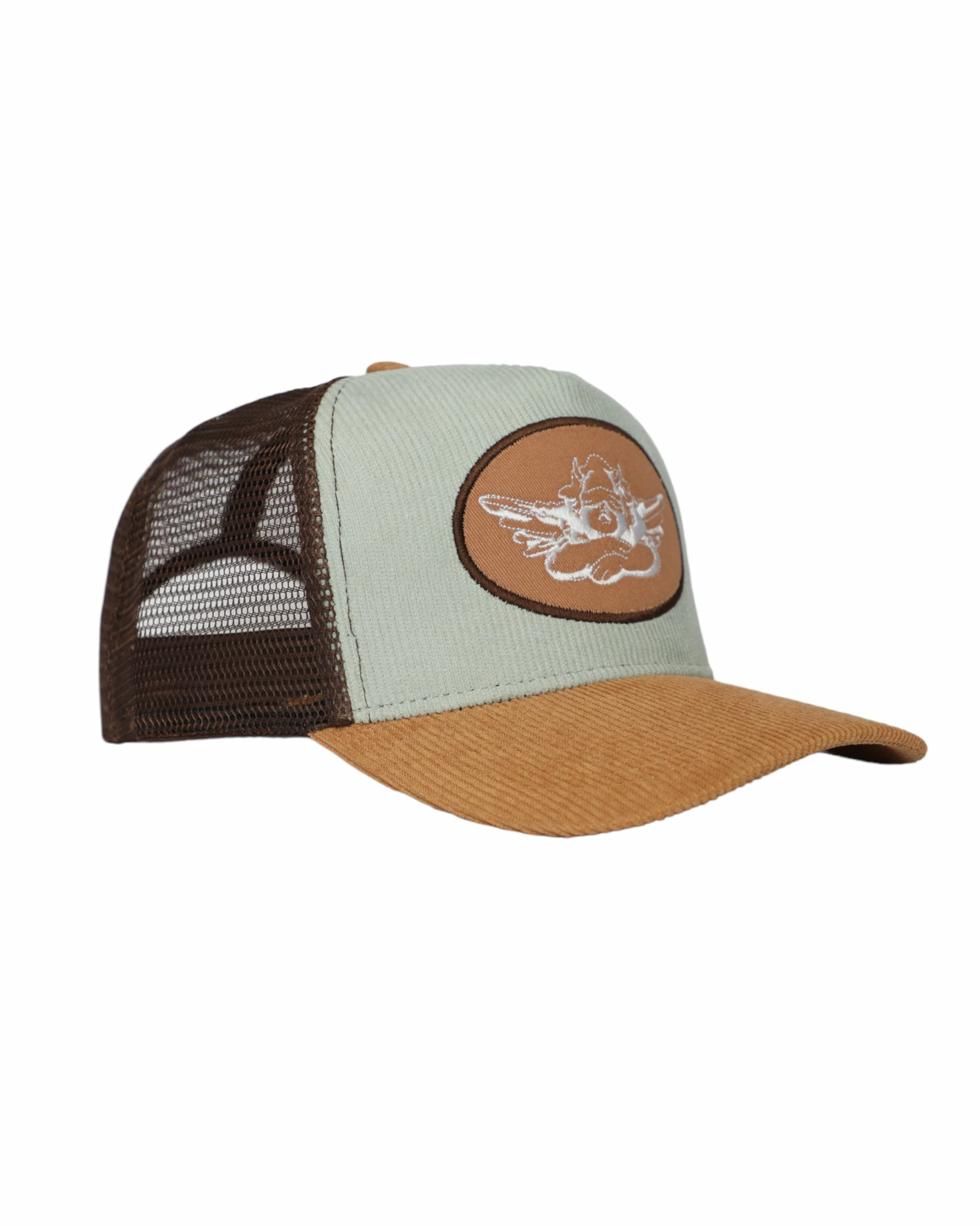 Mint corduroy trucker hat with a tan patch and brim. Adjustable snapback.