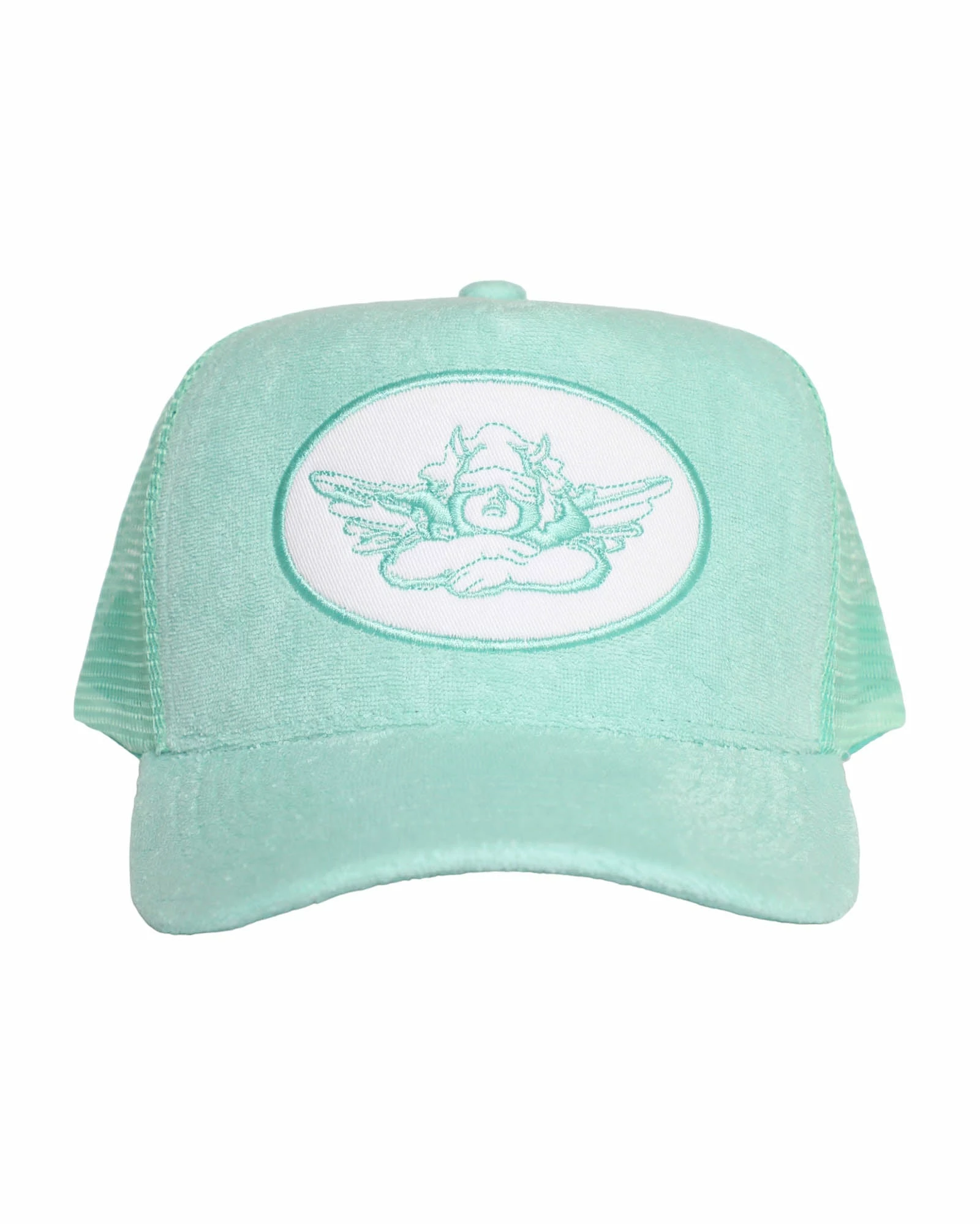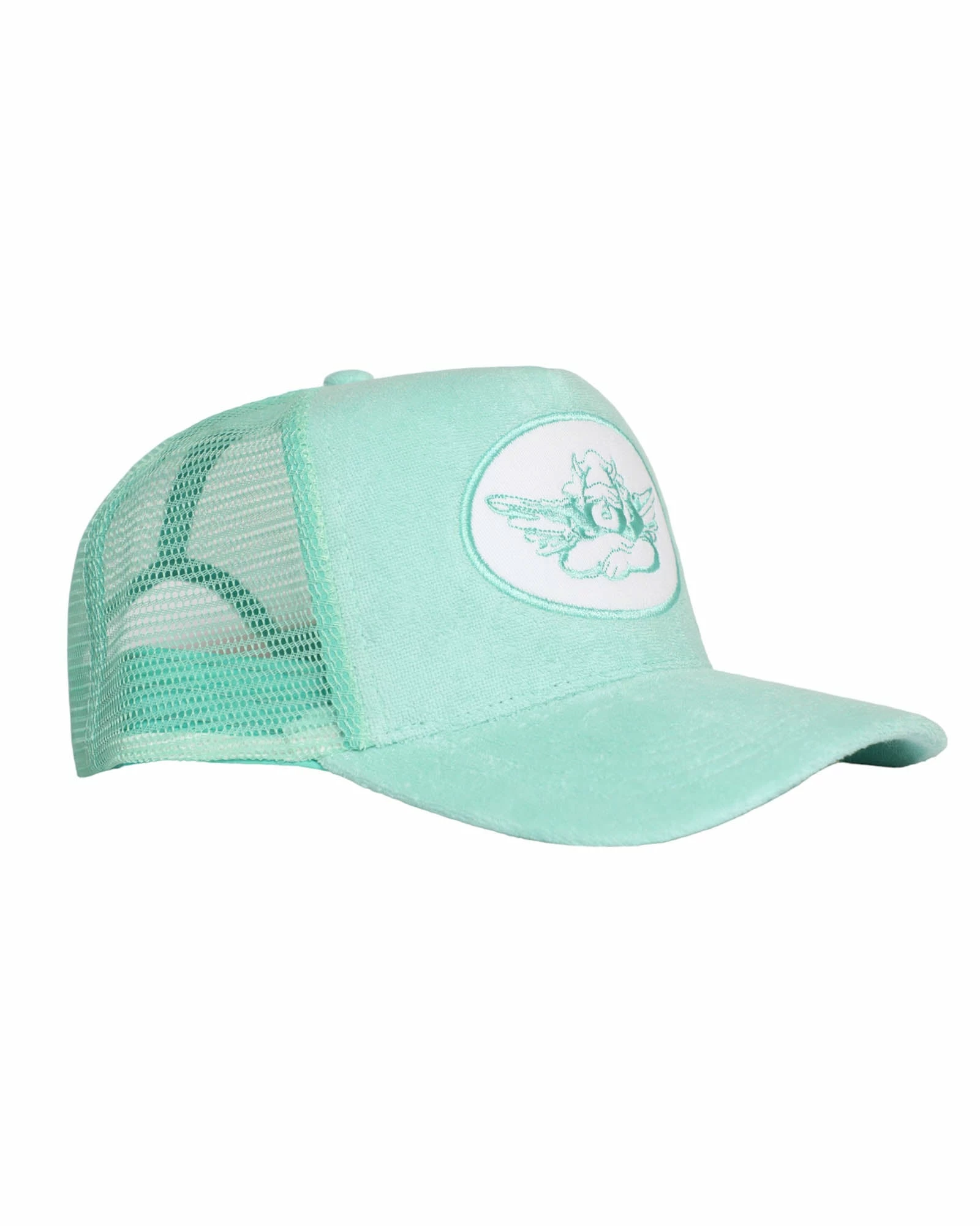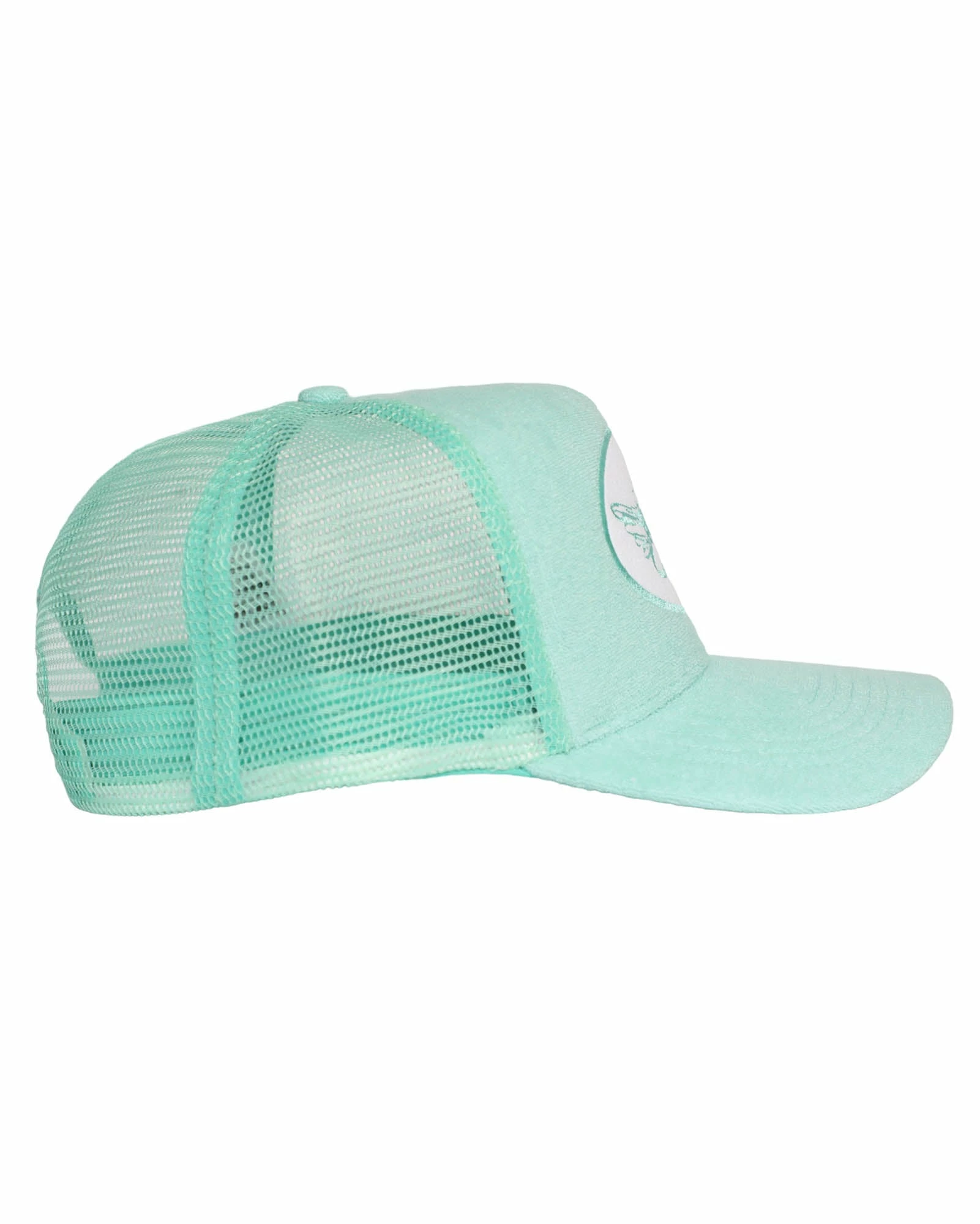 Mint green trucker hat with white patch and mint green terry cloth. Adjustable snapback.