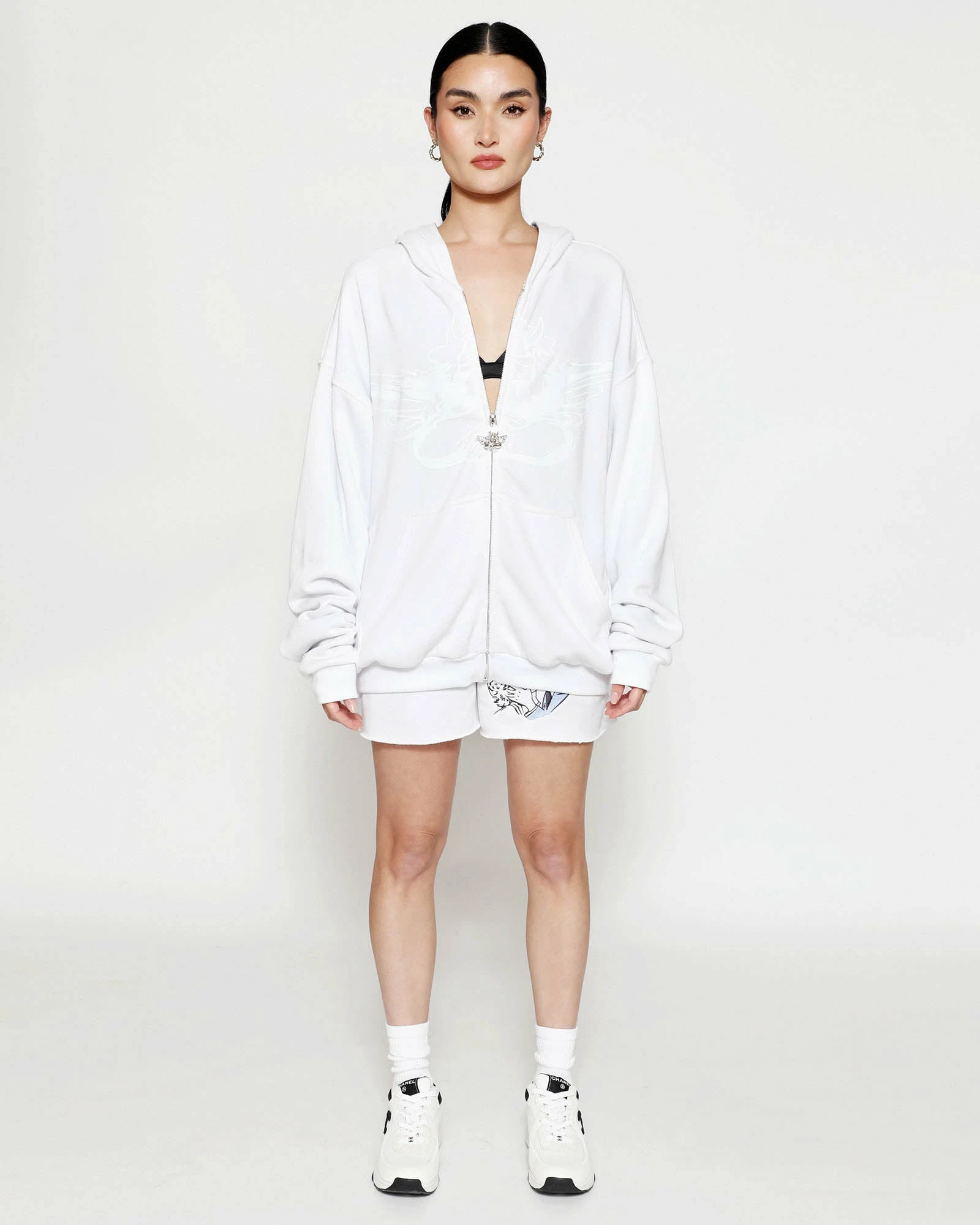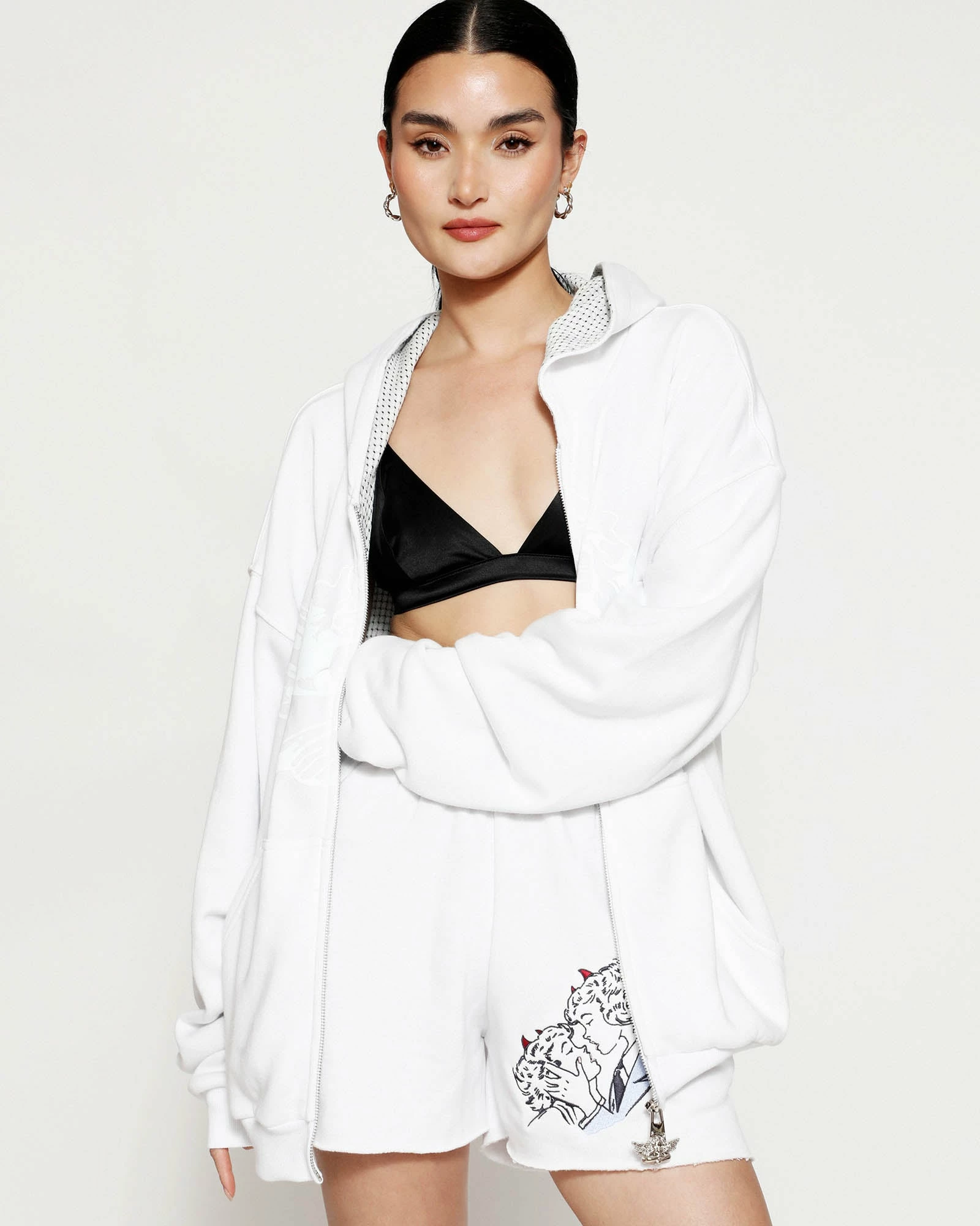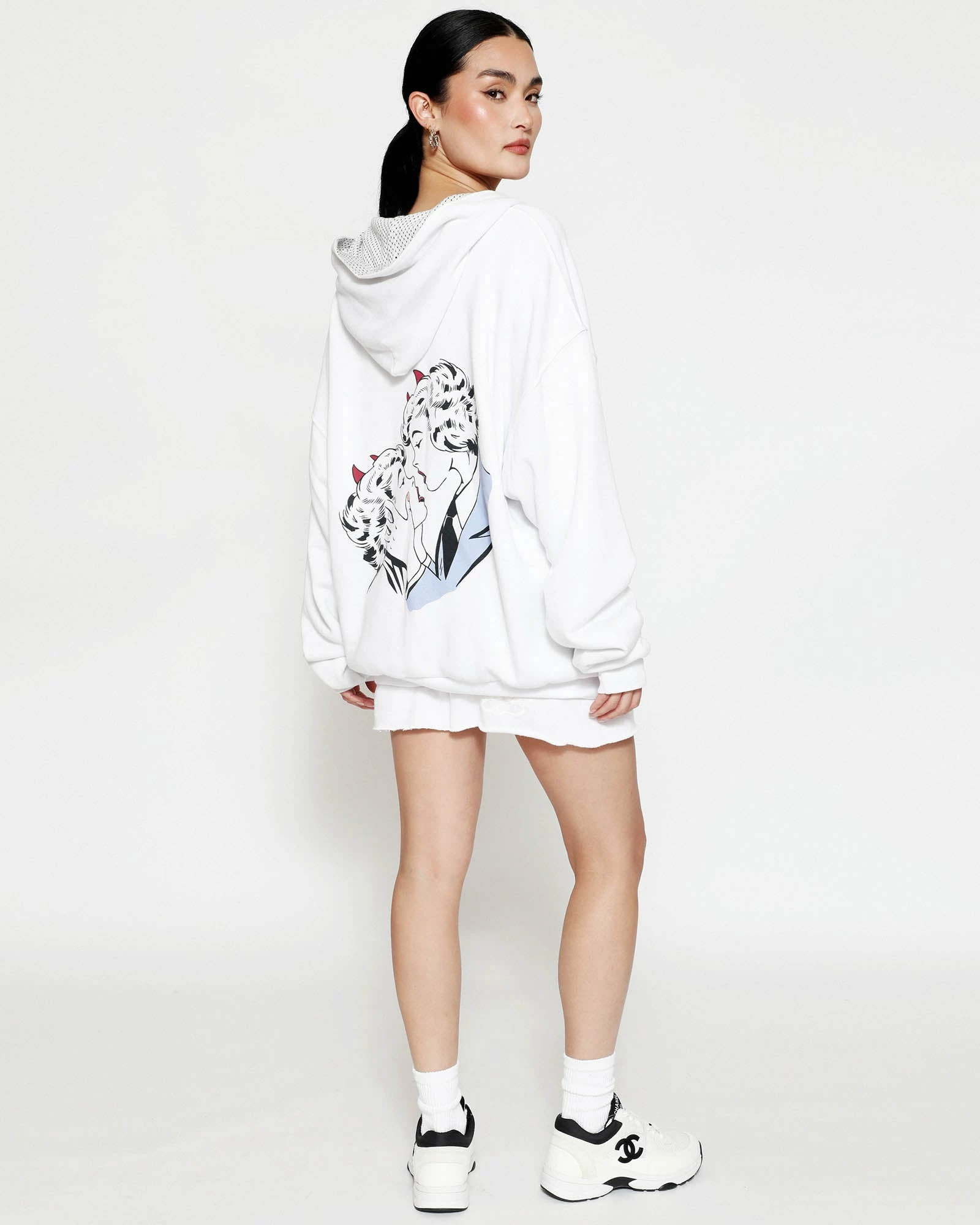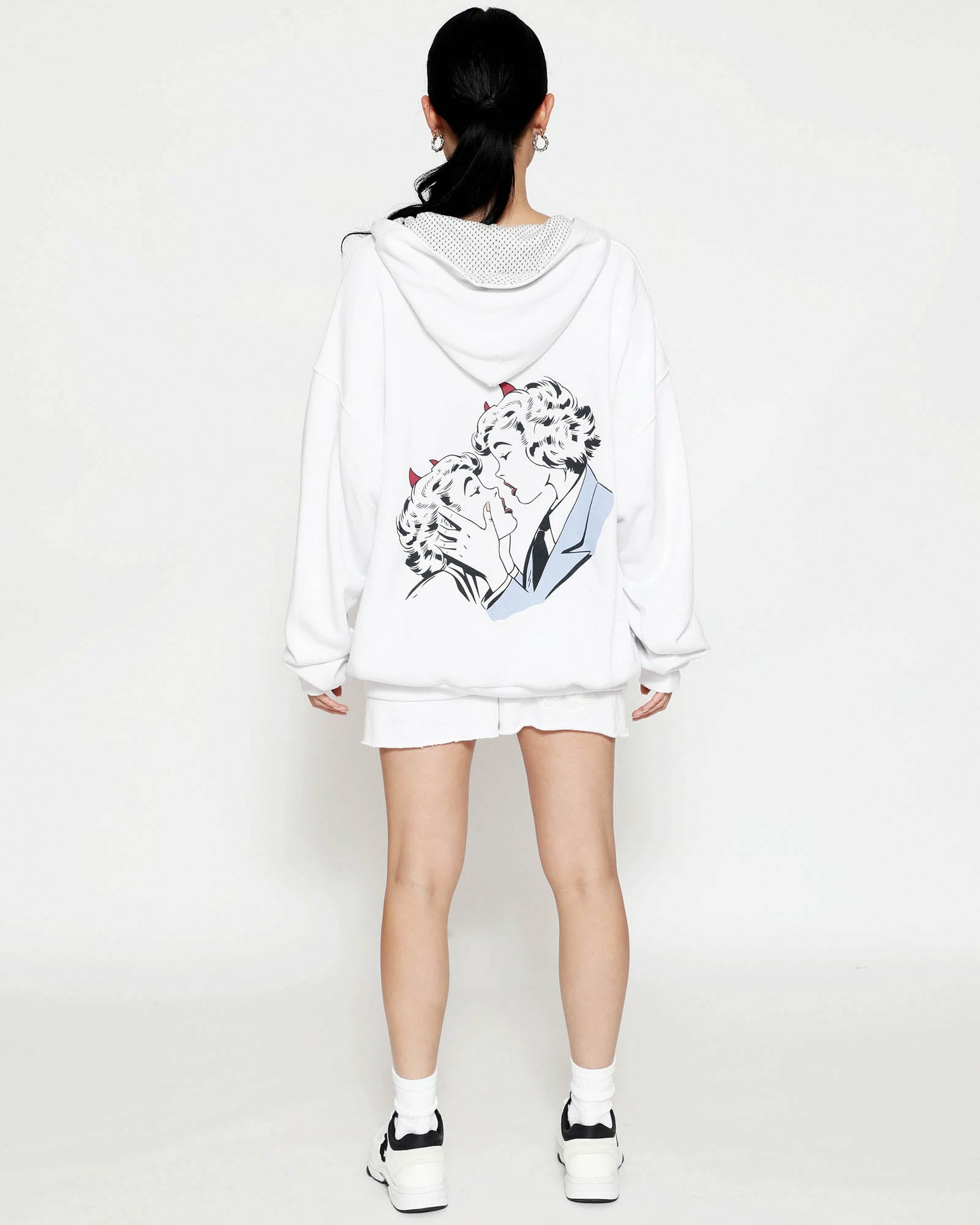 Fleece fabric in white. Oversized zip-up hoodie with inside lining, front pockets, and ribbed cuffs. Features extra large Boys Lie logo zipper pull and embroidered graphic.