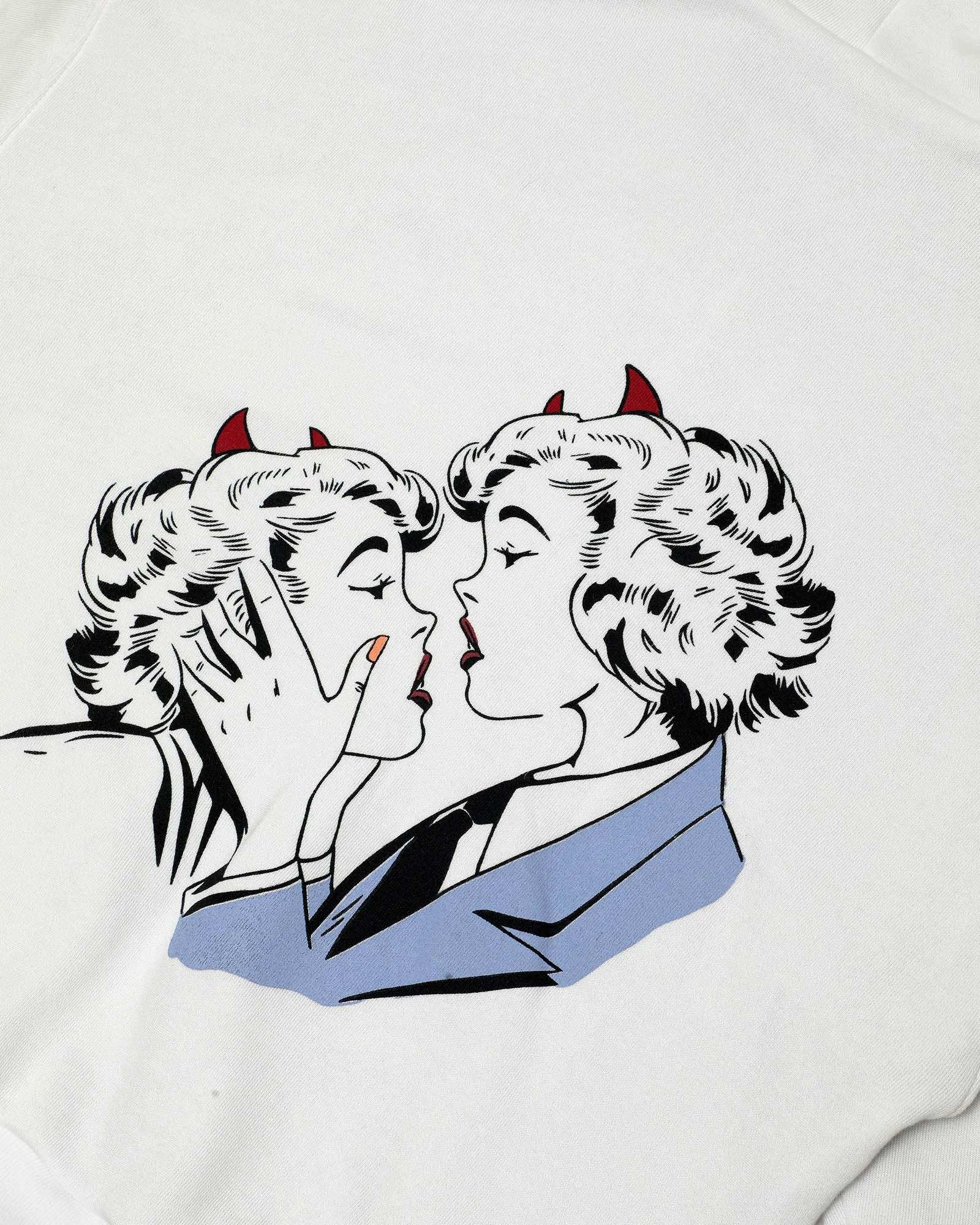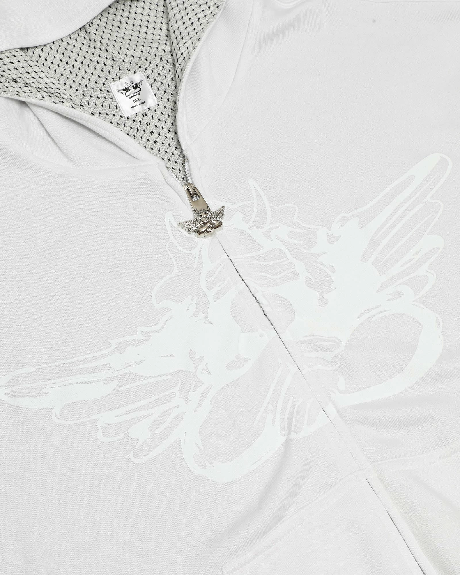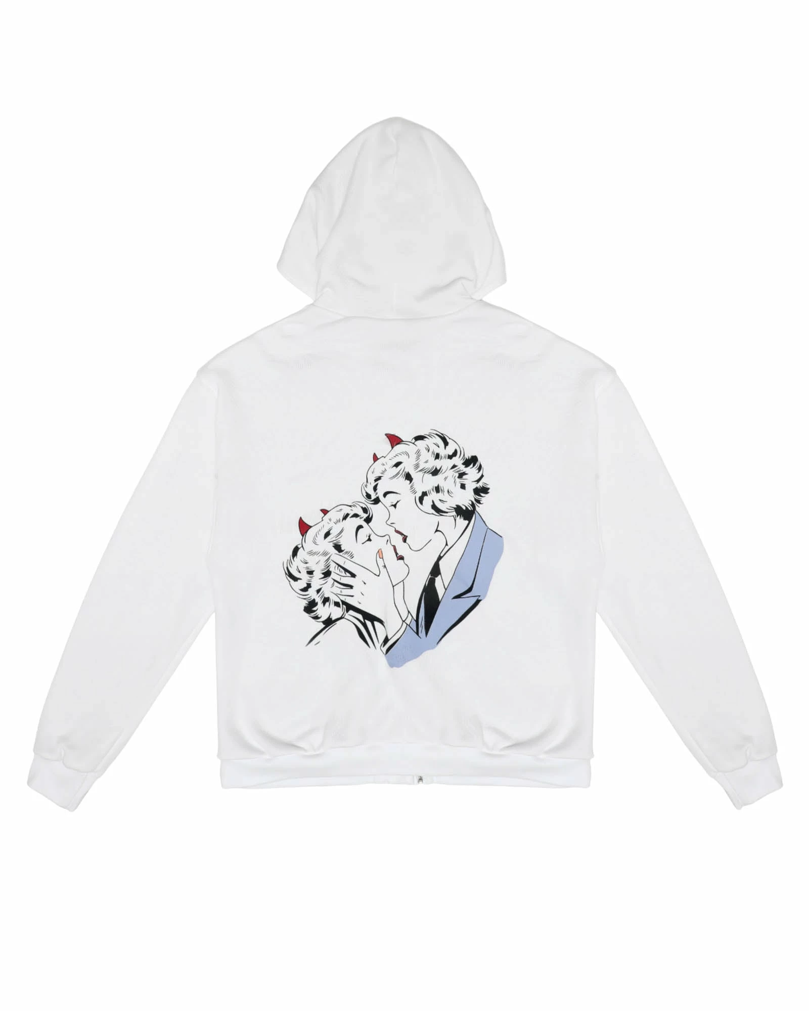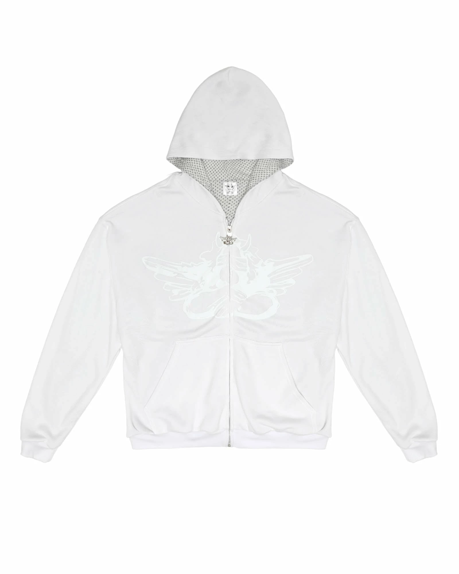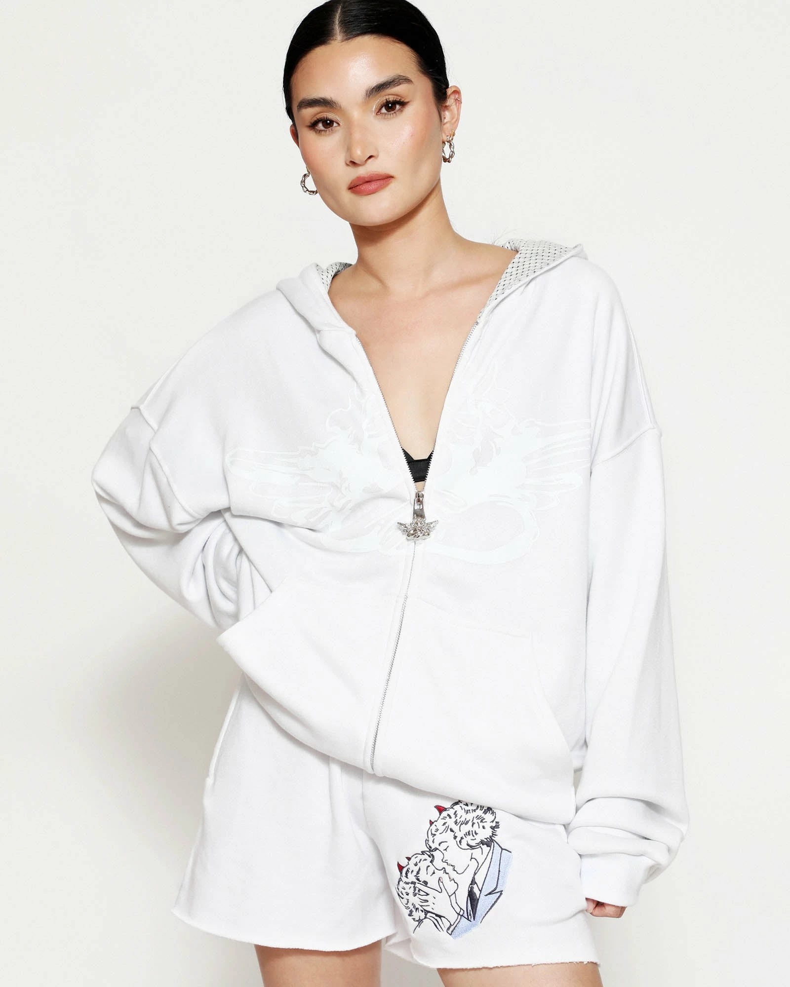 Fleece fabric in white. Oversized zip-up hoodie with inside lining, front pockets, and ribbed cuffs. Features extra large Boys Lie logo zipper pull and embroidered graphic.