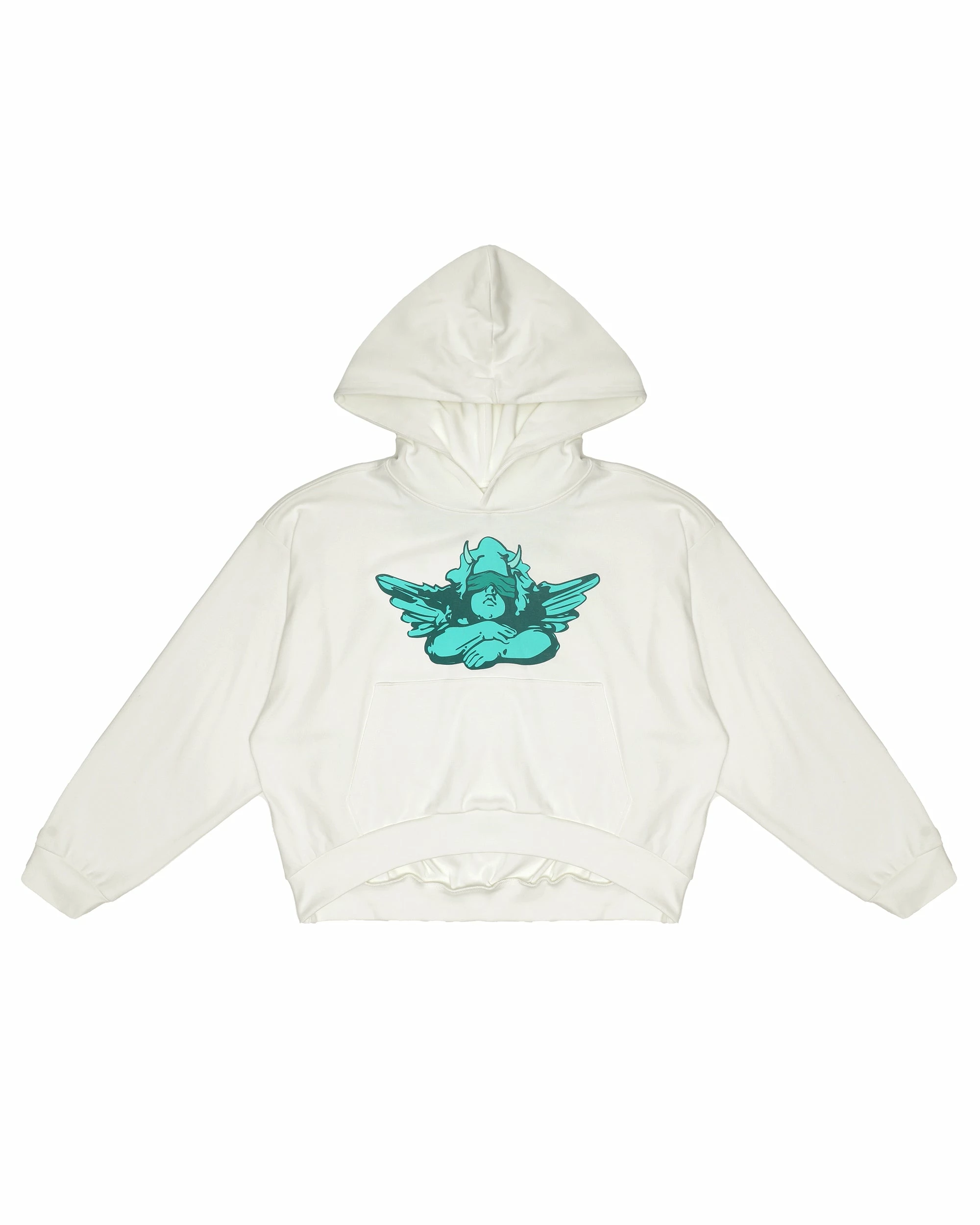 Heavyweight ribbed fabric in cream. Oversized cropped hoodie featuring a dramatic hood, front pocket, and slightly curved front hem.