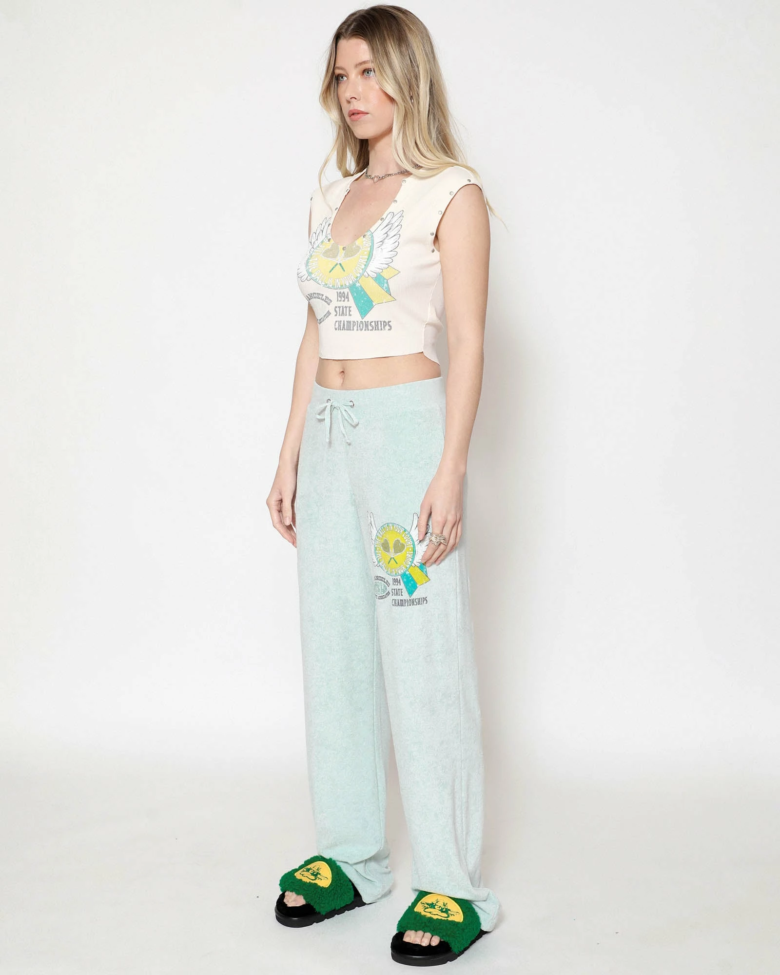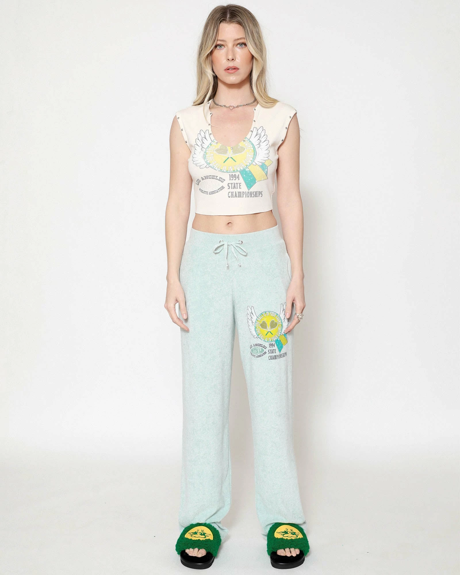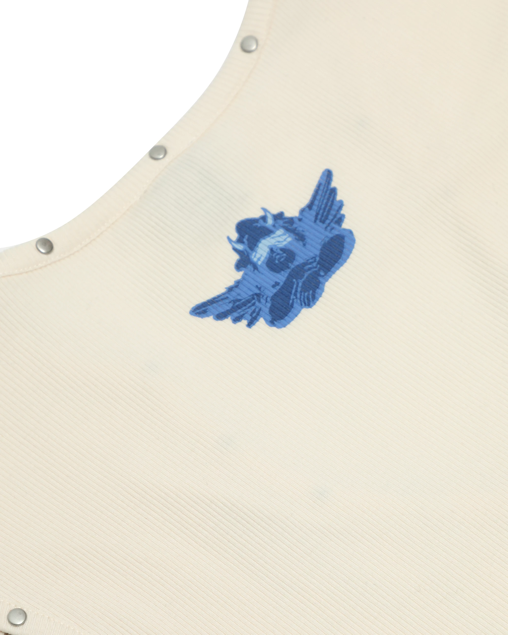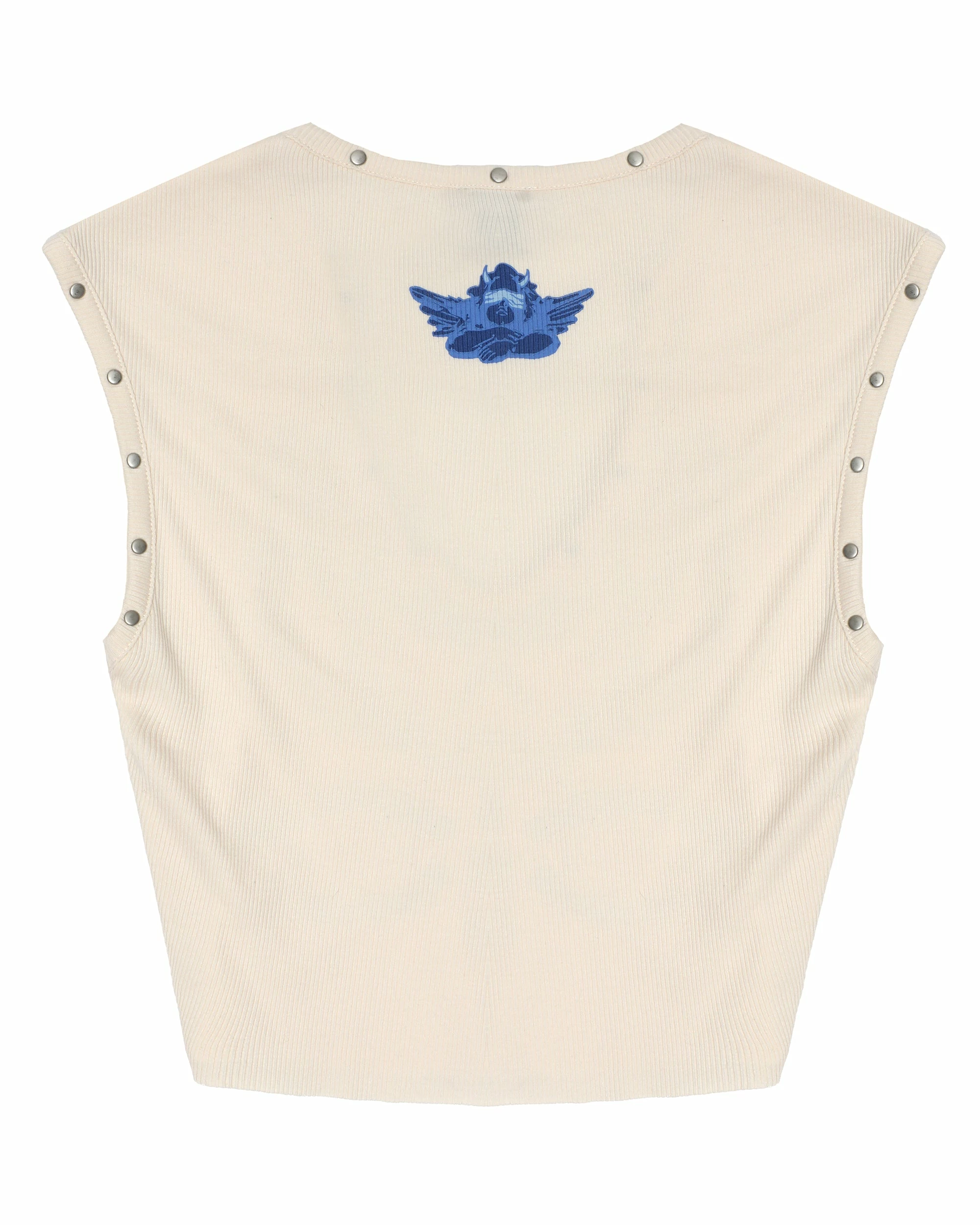 Nude ribbed crop tank with a V neckline and silver stud details.