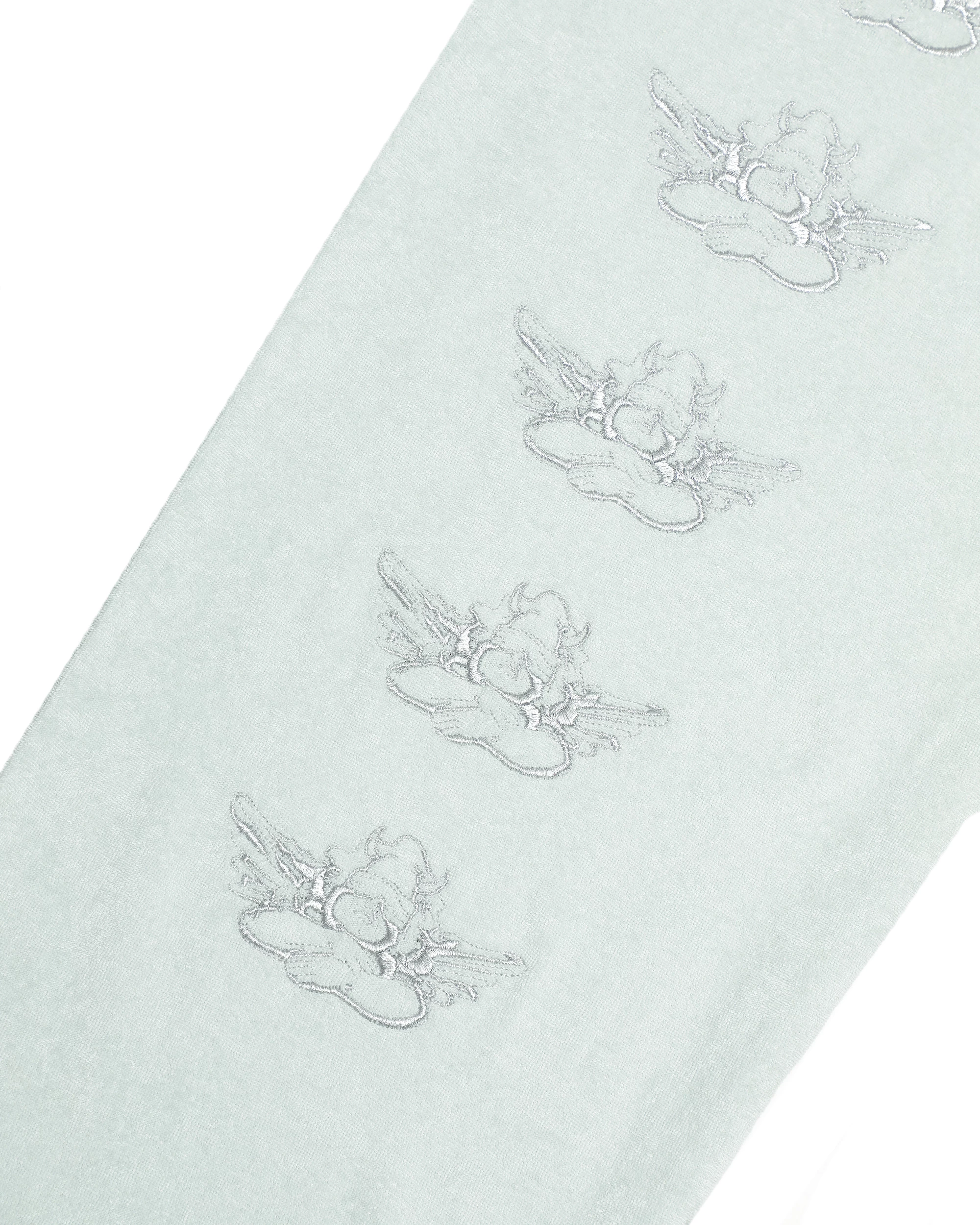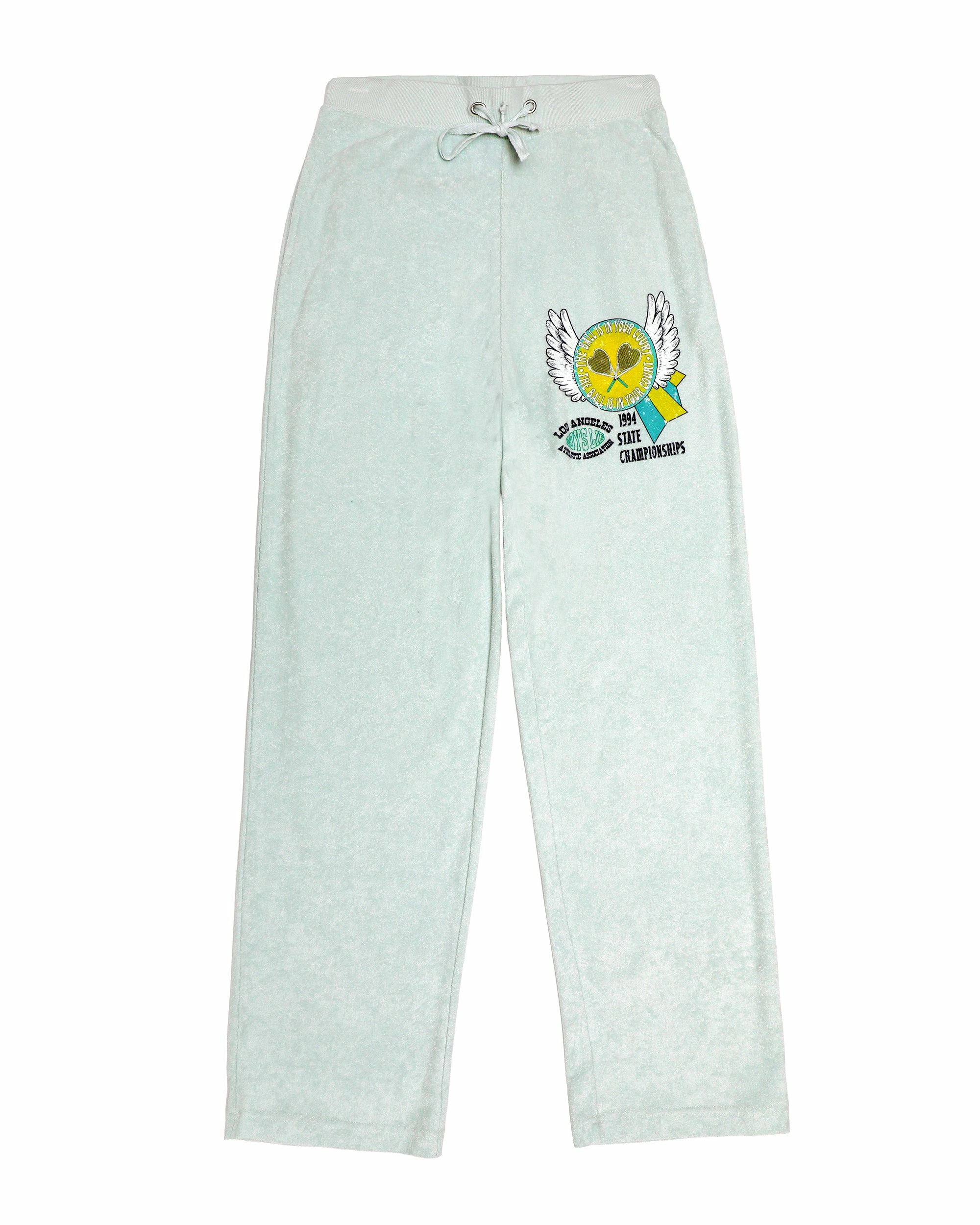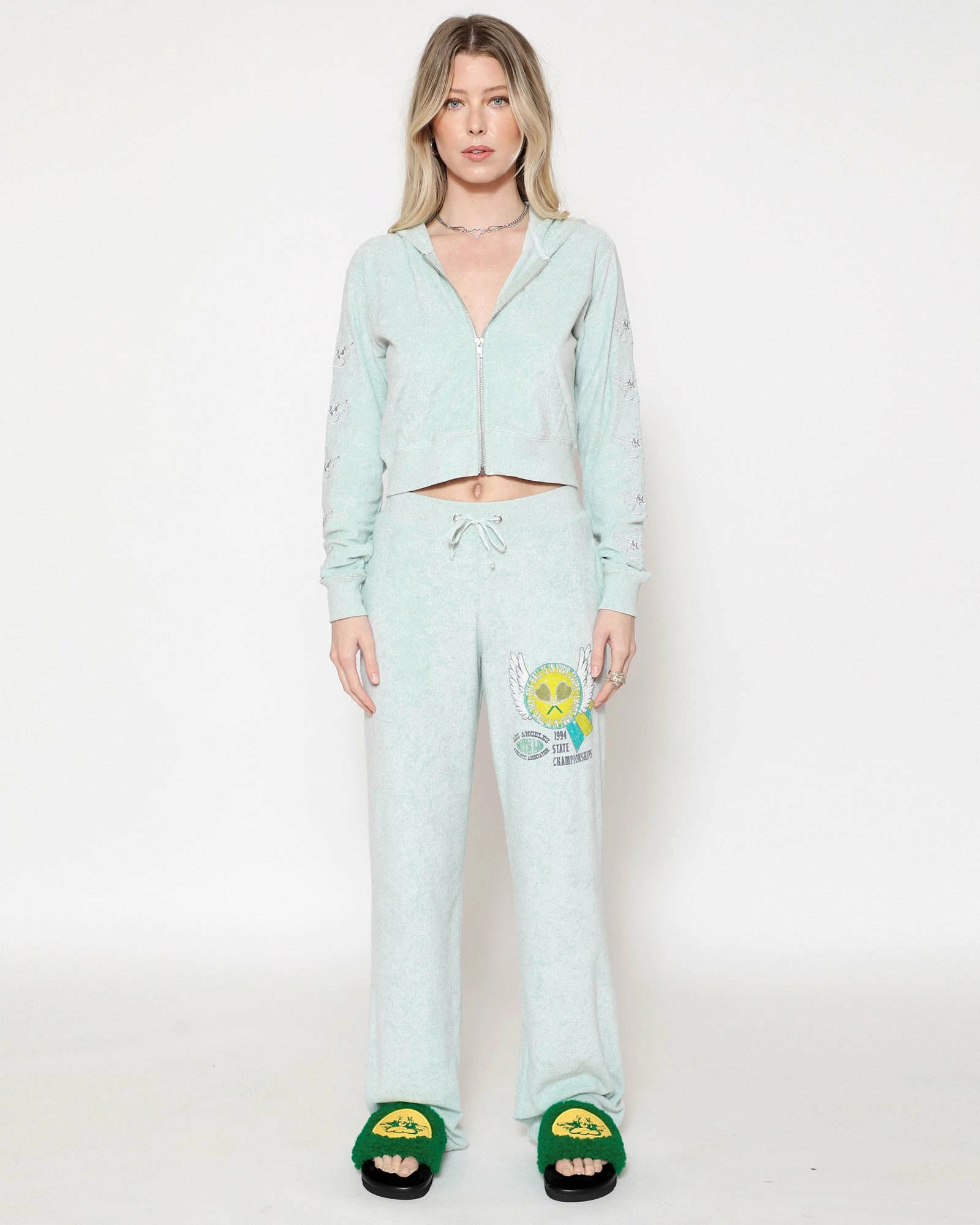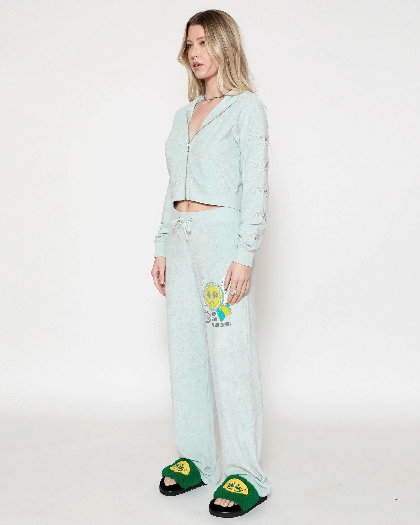 Lightweight terry cloth fabric in light blue-green. High rise sweatpants with side pockets, a drawstring waist, and straight leg with long inseam. Features metallic embroidery down the legs.