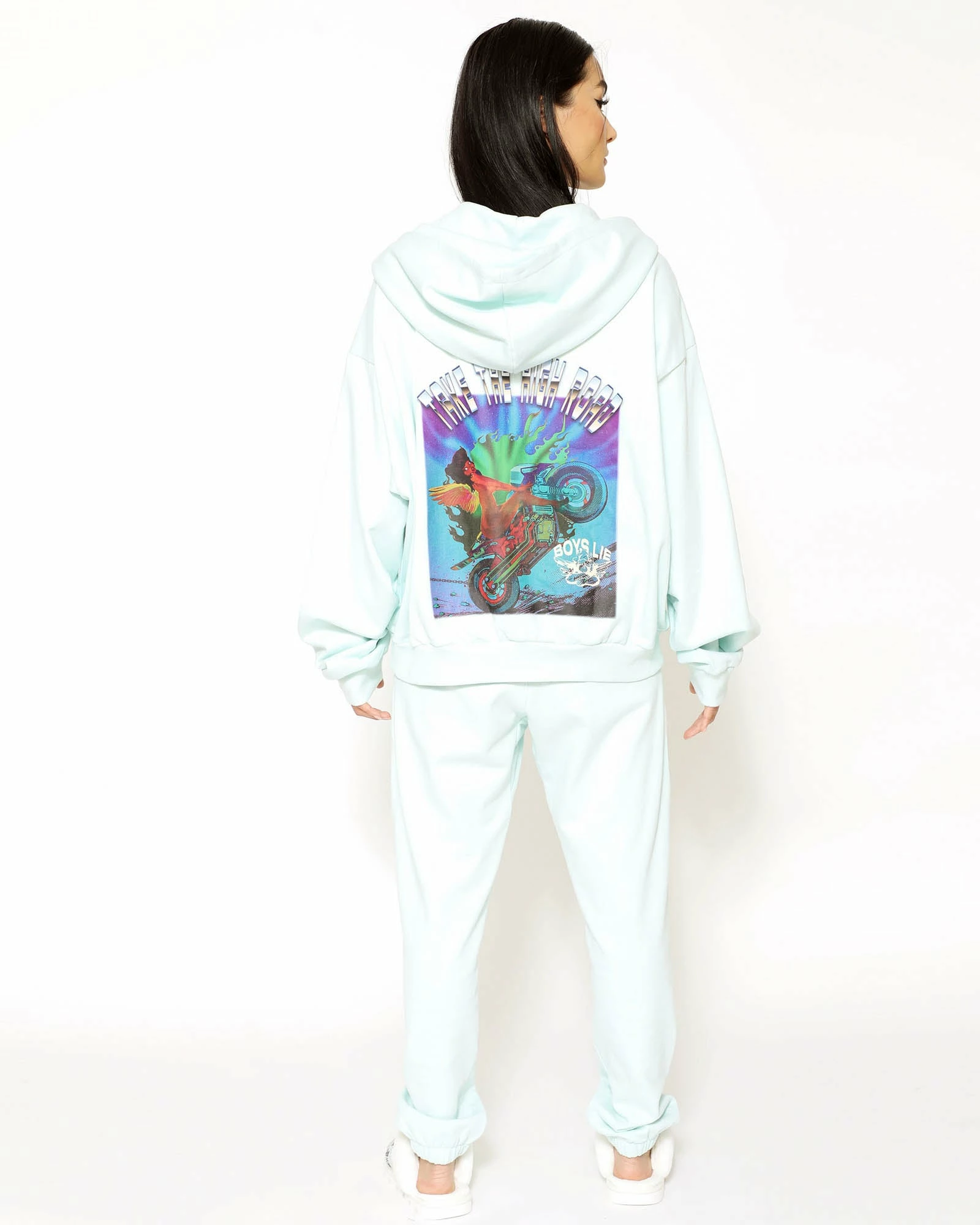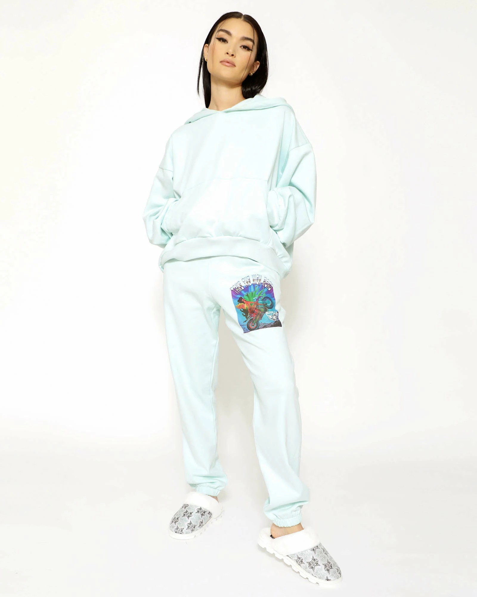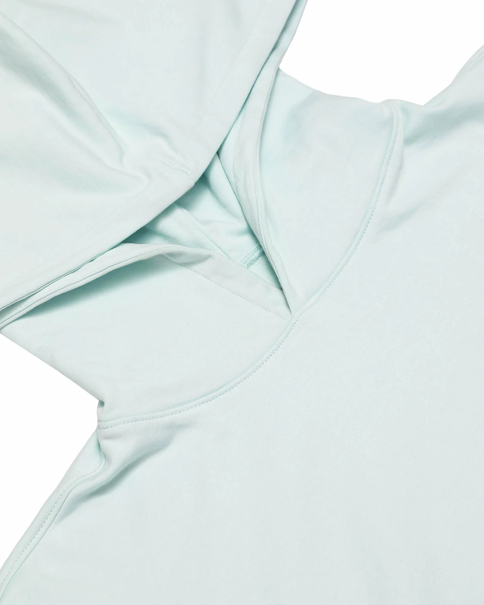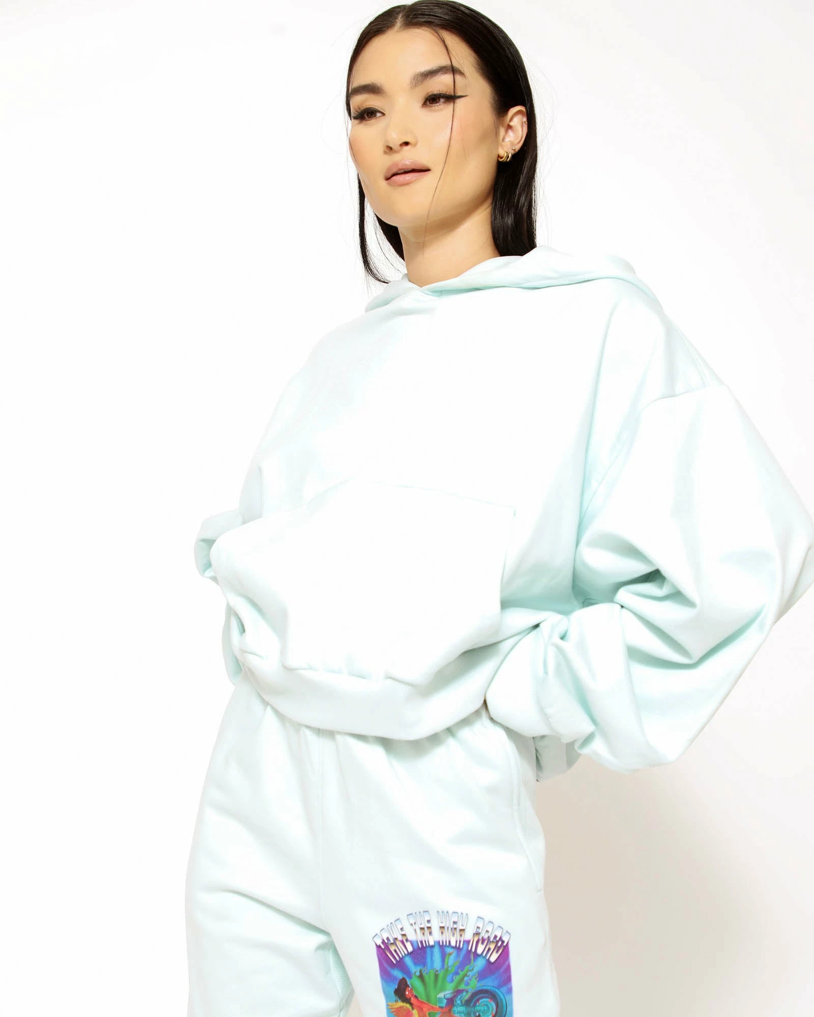 Mid-weight fleece fabric in mint green. Oversized cropped hoodie featuring a dramatic hood, front pocket, and slightly curved front hem.