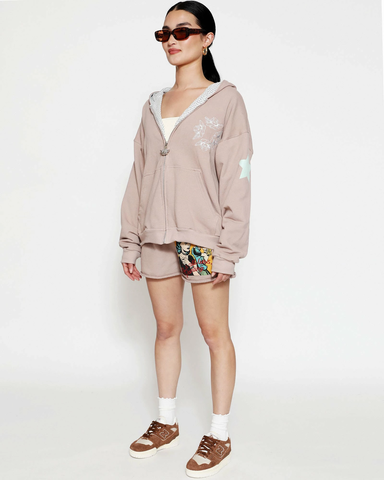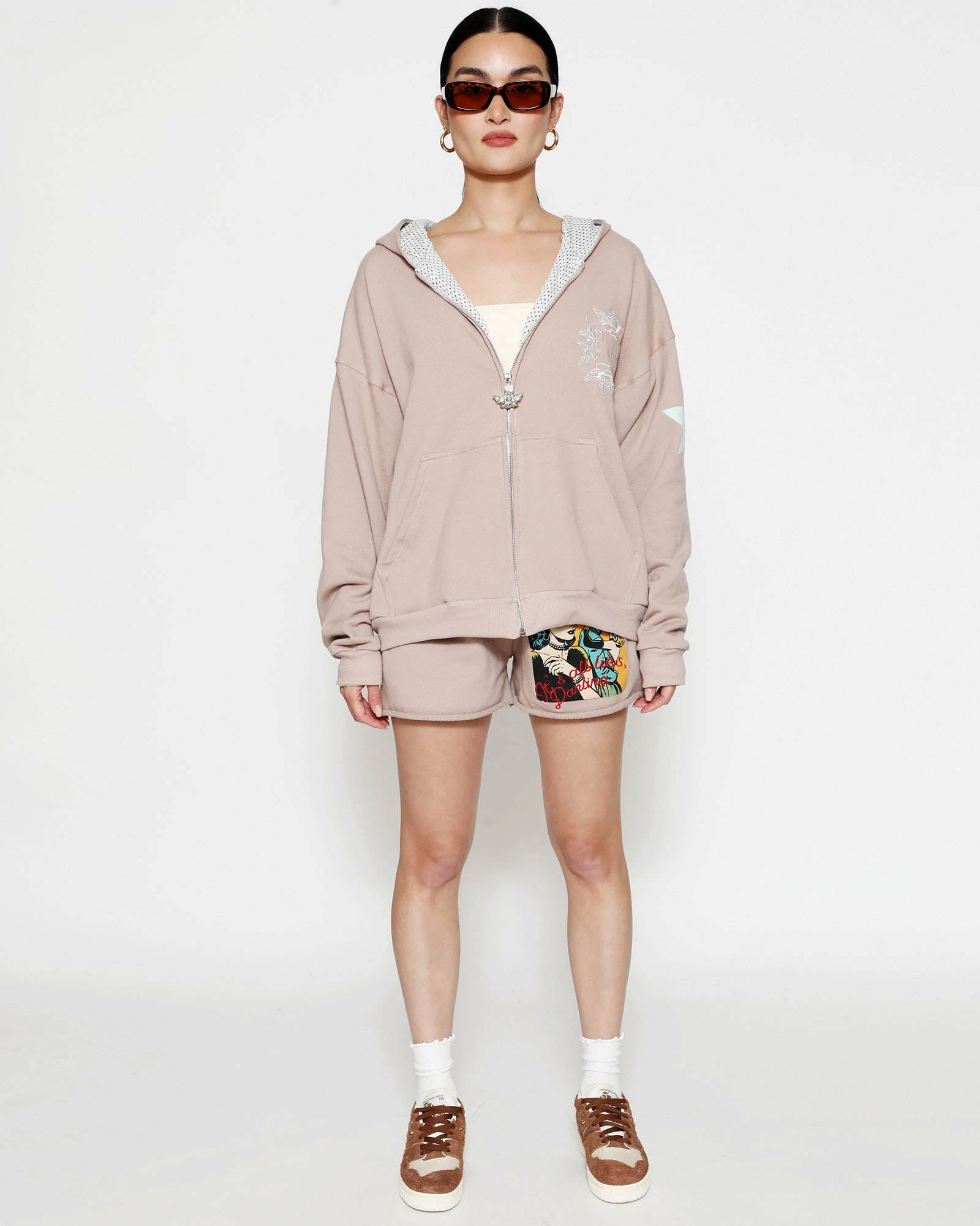 French terry fabric in taupe. Oversized zip up hoodie with inside lining, front pockets, and ribbed cuffs. Features extra large Boys Lie logo zipper pull and embroidered details.