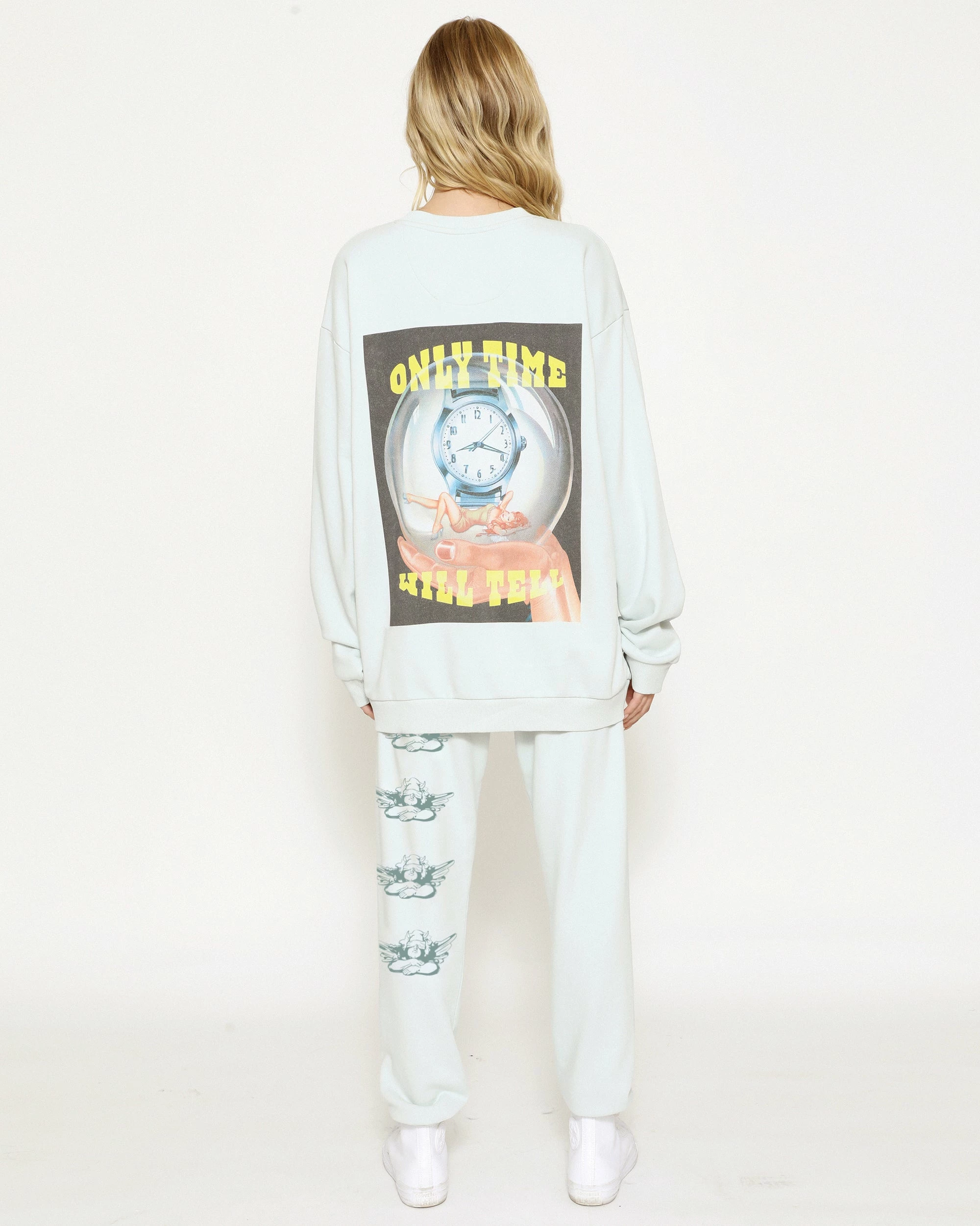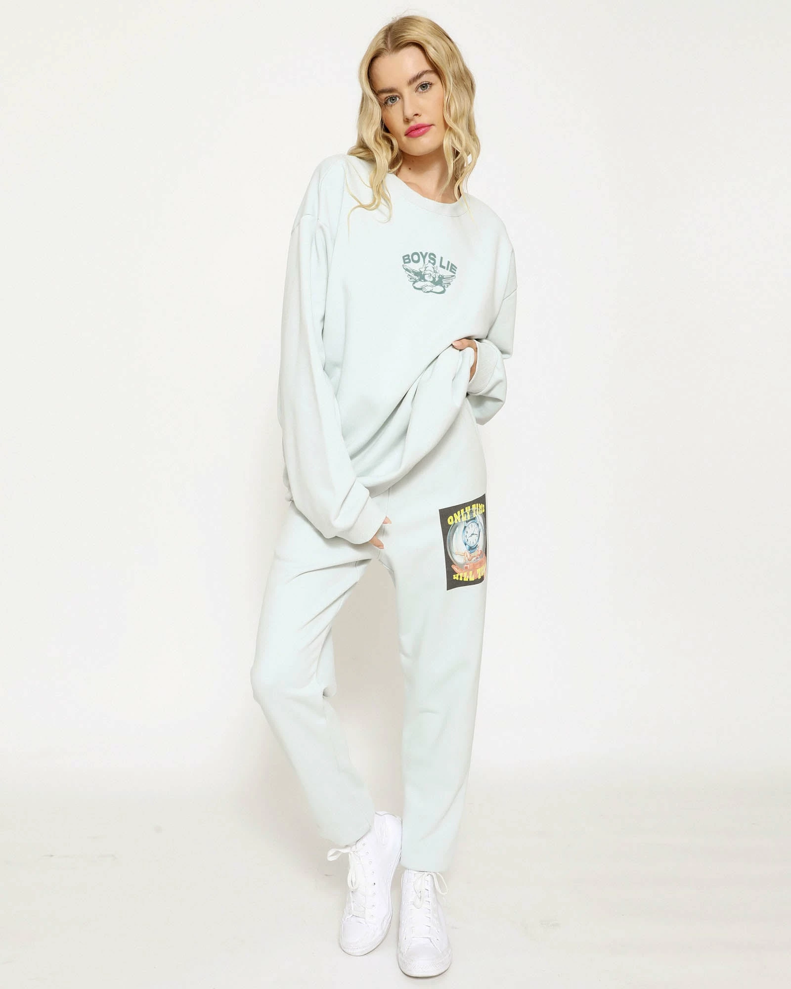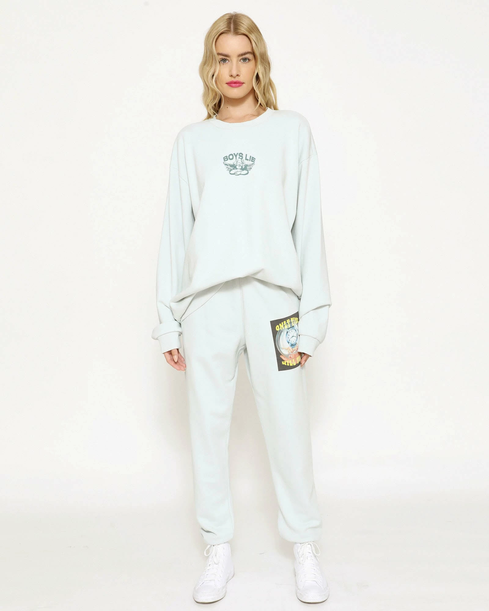 Our new heavyweight french terry fabric in baby blue. High rise sweatpants with back and side pockets, elastic waistband and cuffs.