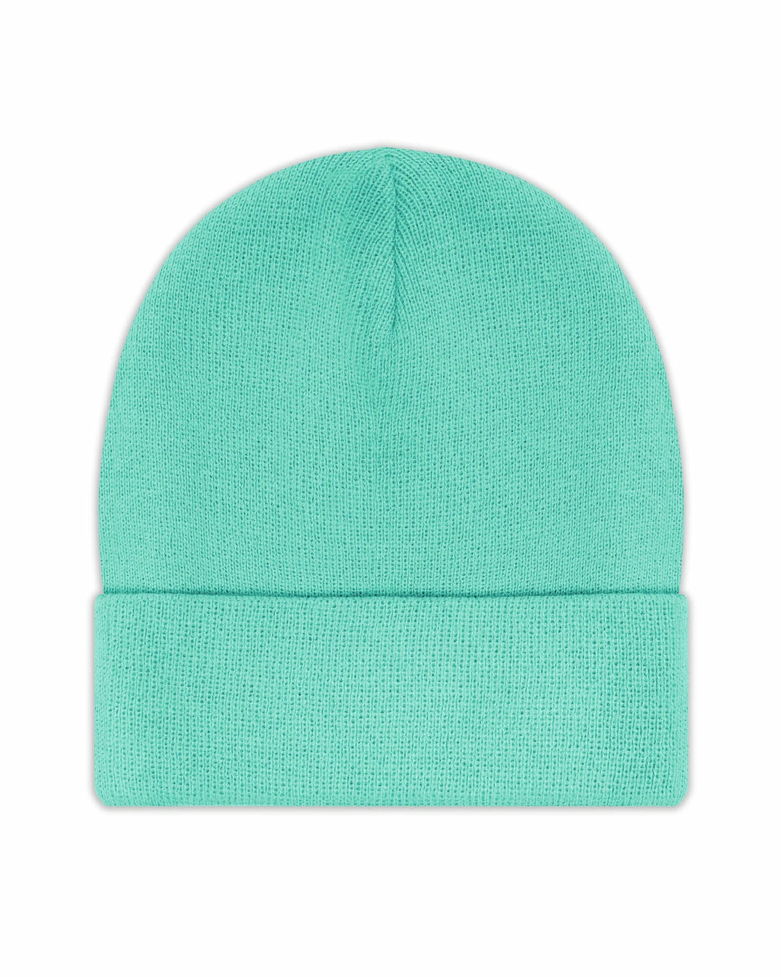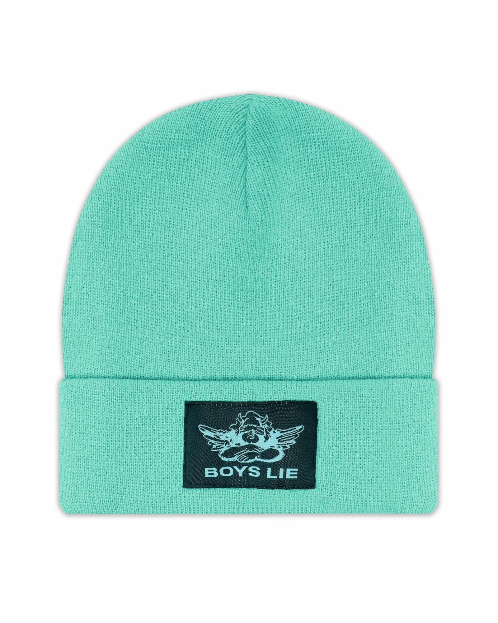 Dark mint beanie with monochromatic teal Boys Lie logo patch.
