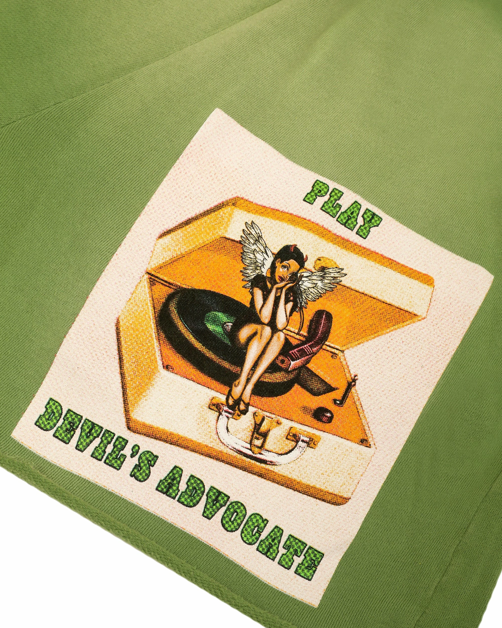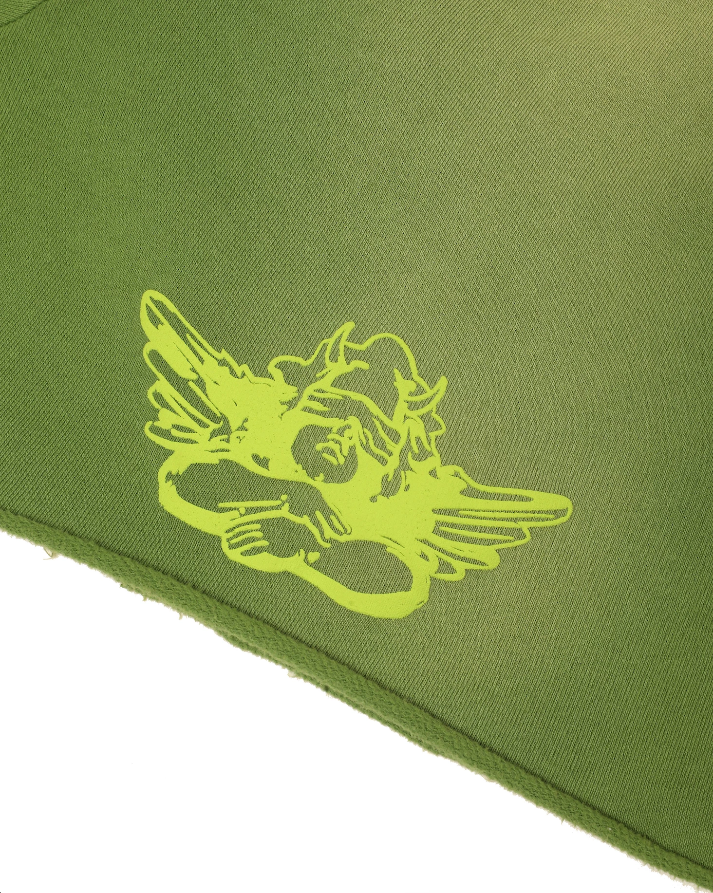 Lightweight french terry fabric in green with potassium spray. High-rise shorts with thick waistband, adjustable drawstring, side pockets, and raw edge hem. Features puff print detail.