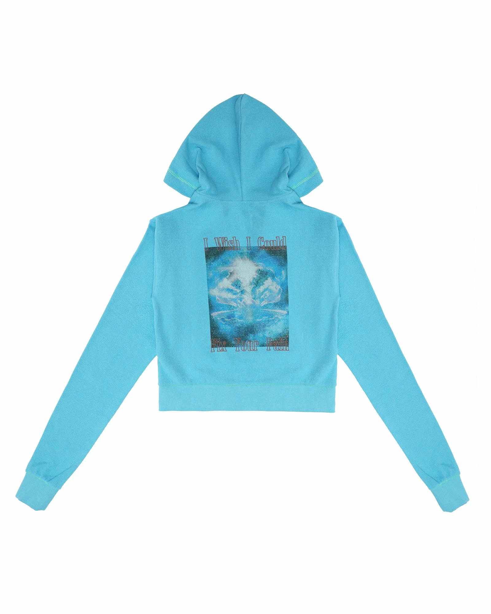 Inside out french terry fabric in bright blue. Zip up hoodie with cropped hem, front pockets, and ribbed cuffs. Features contract stitching details, puff print logos, and rhinestone embellishments.