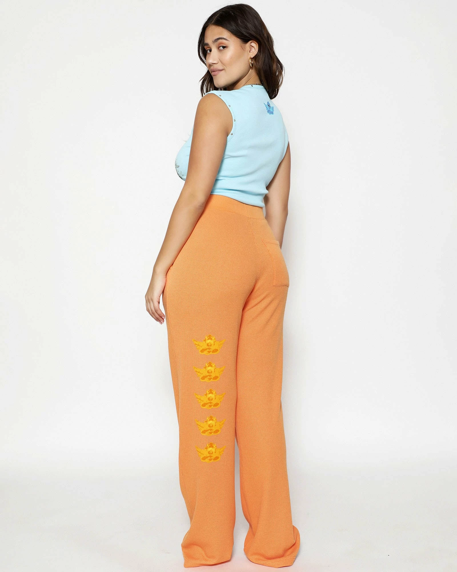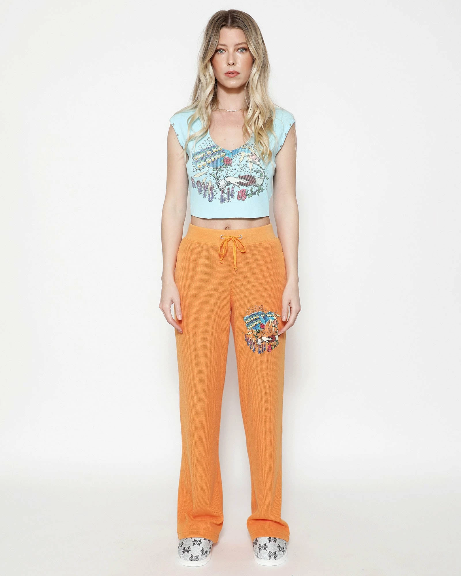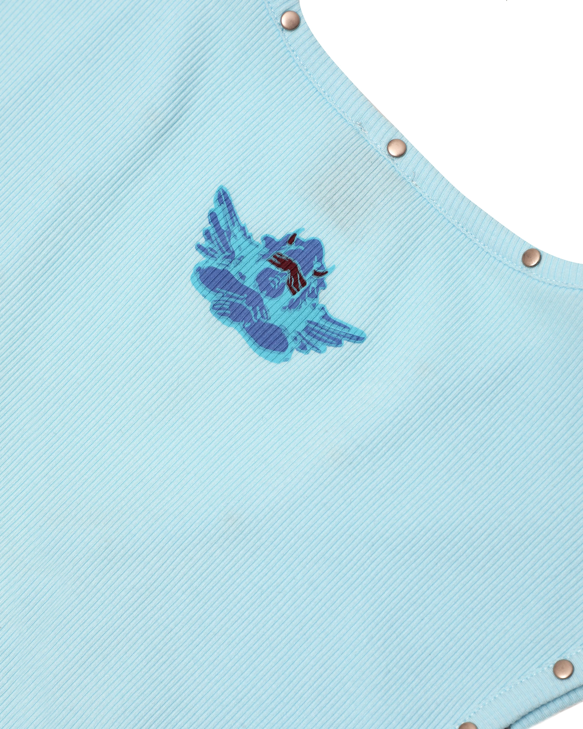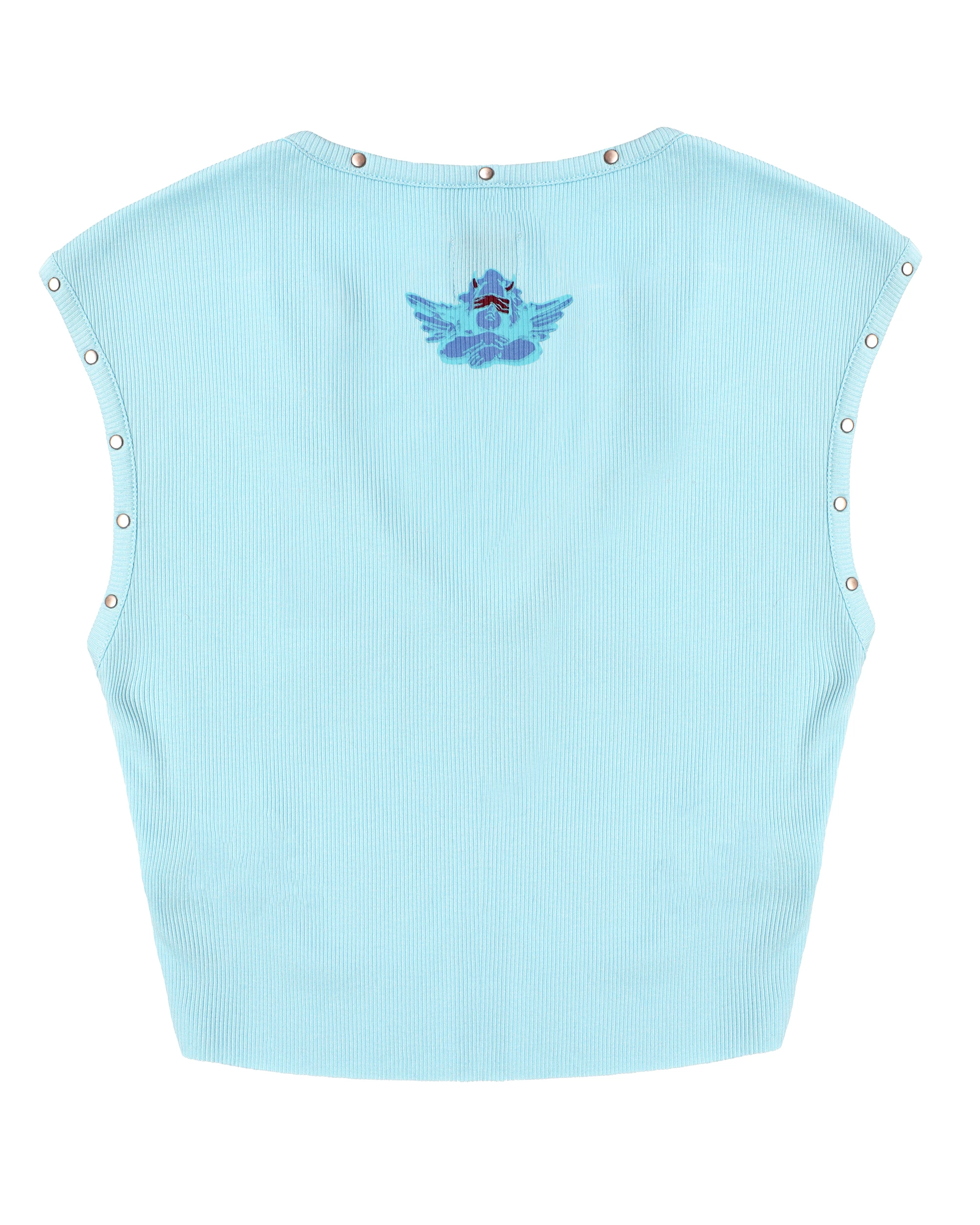 Blue ribbed crop tank with a V neckline and silver stud details.