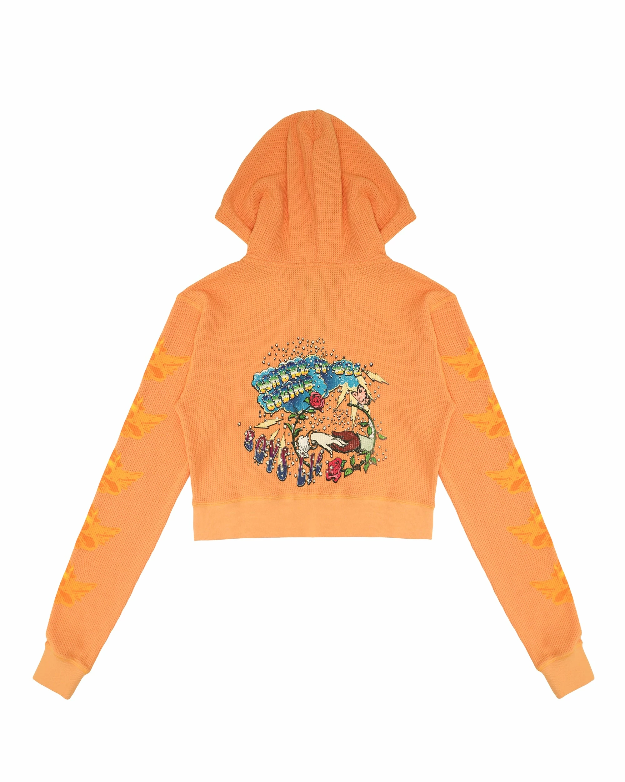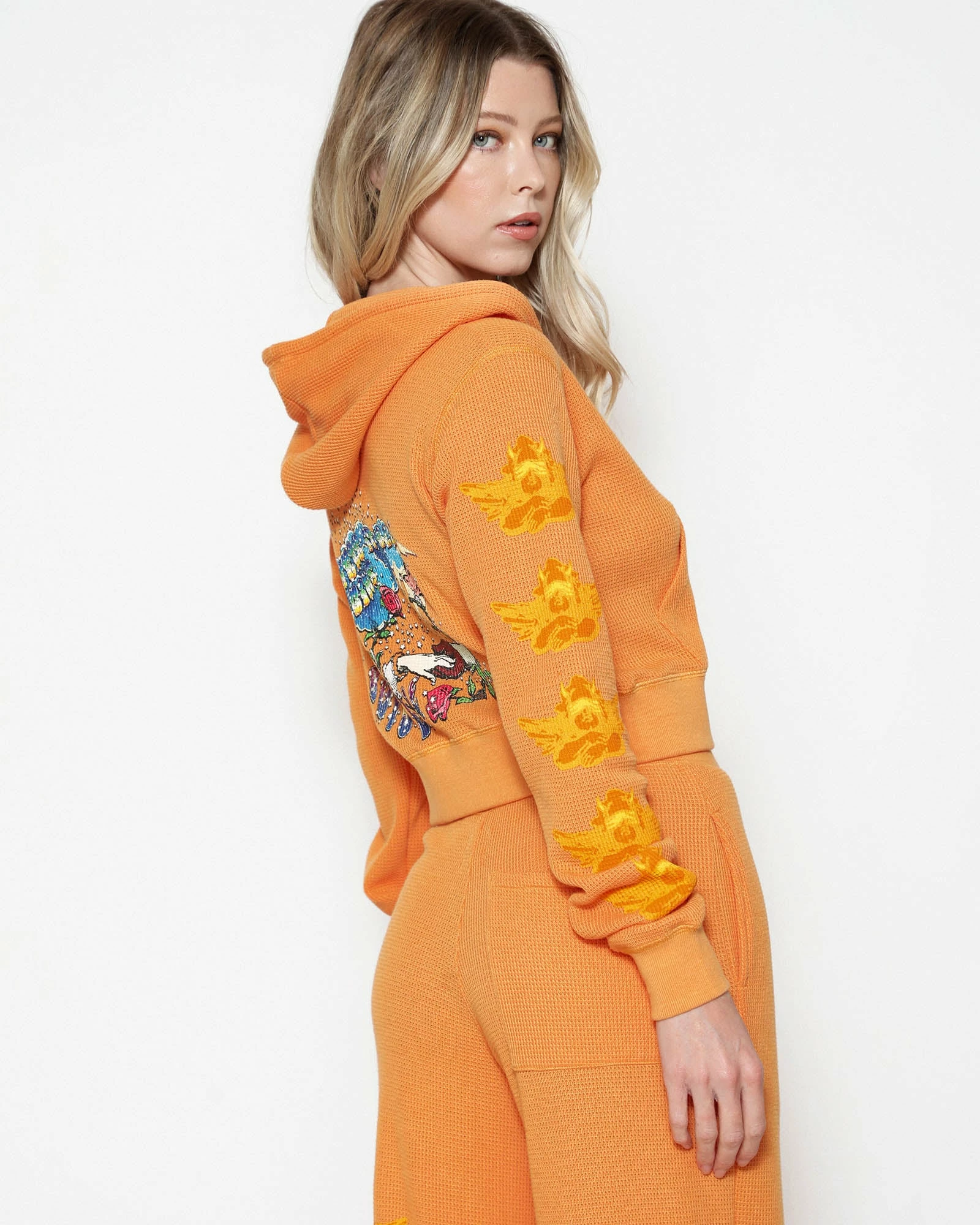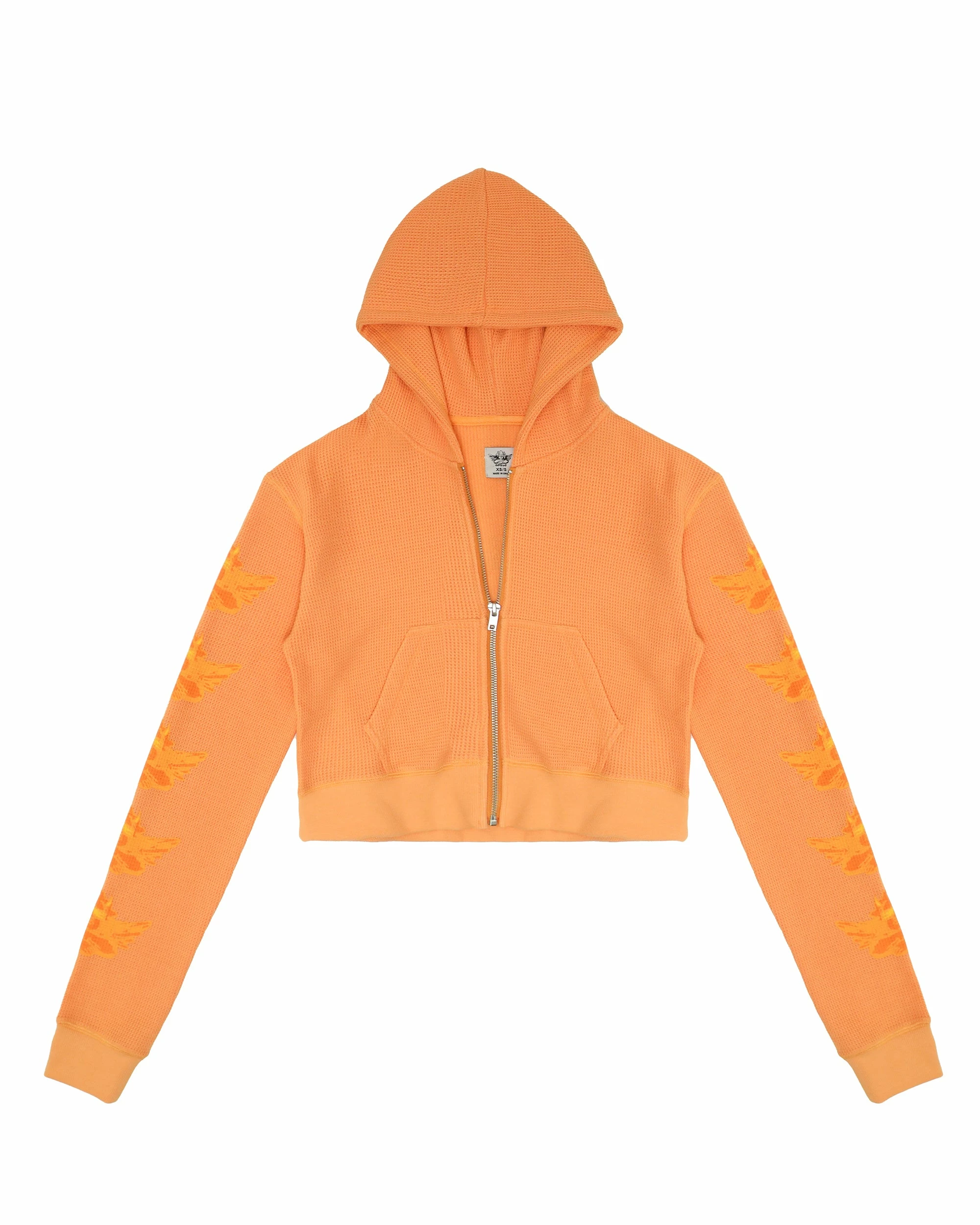 Super soft thermal fabric in bright orange. Zip up hoodie with cropped hem, front pockets, and ribbed cuffs.