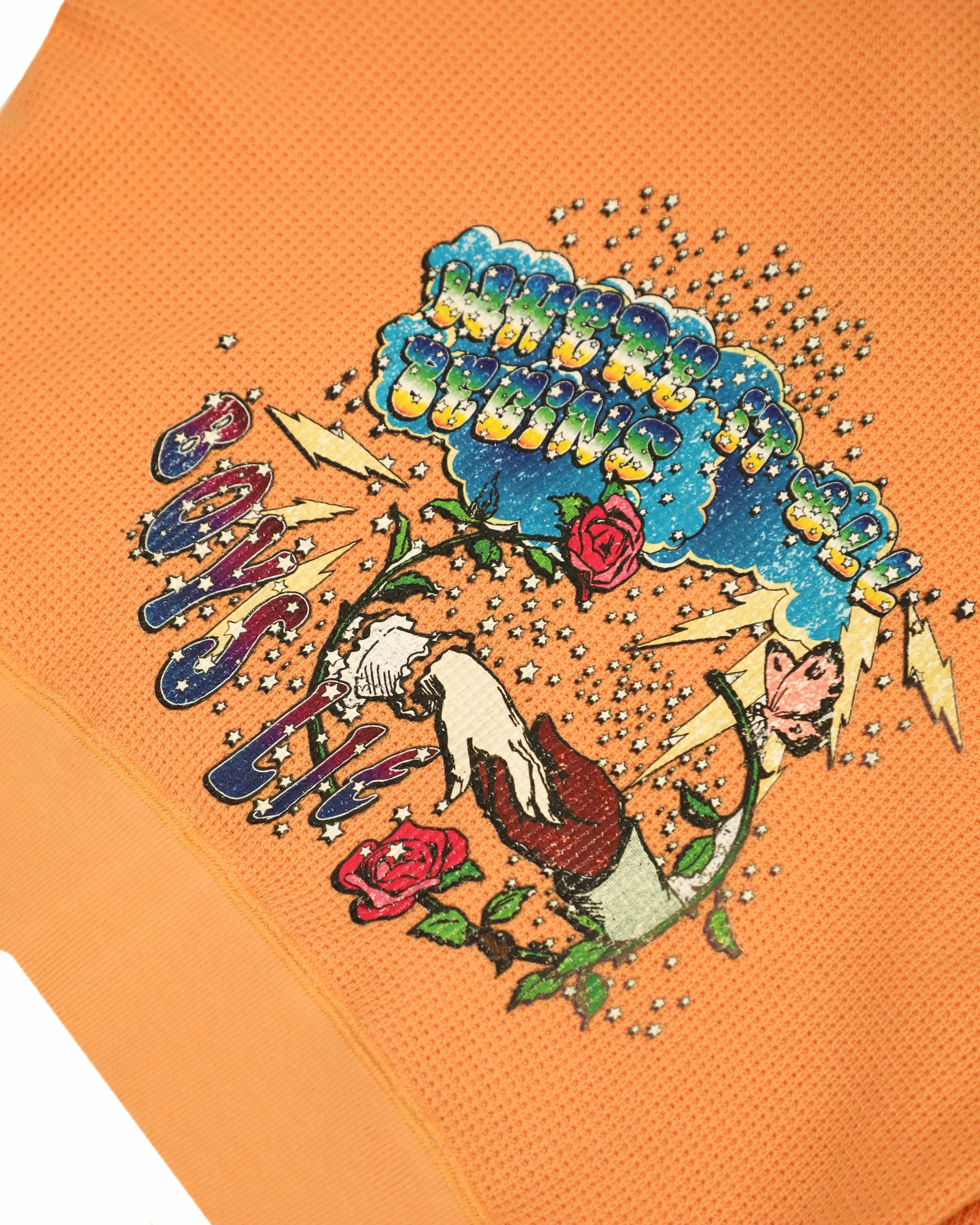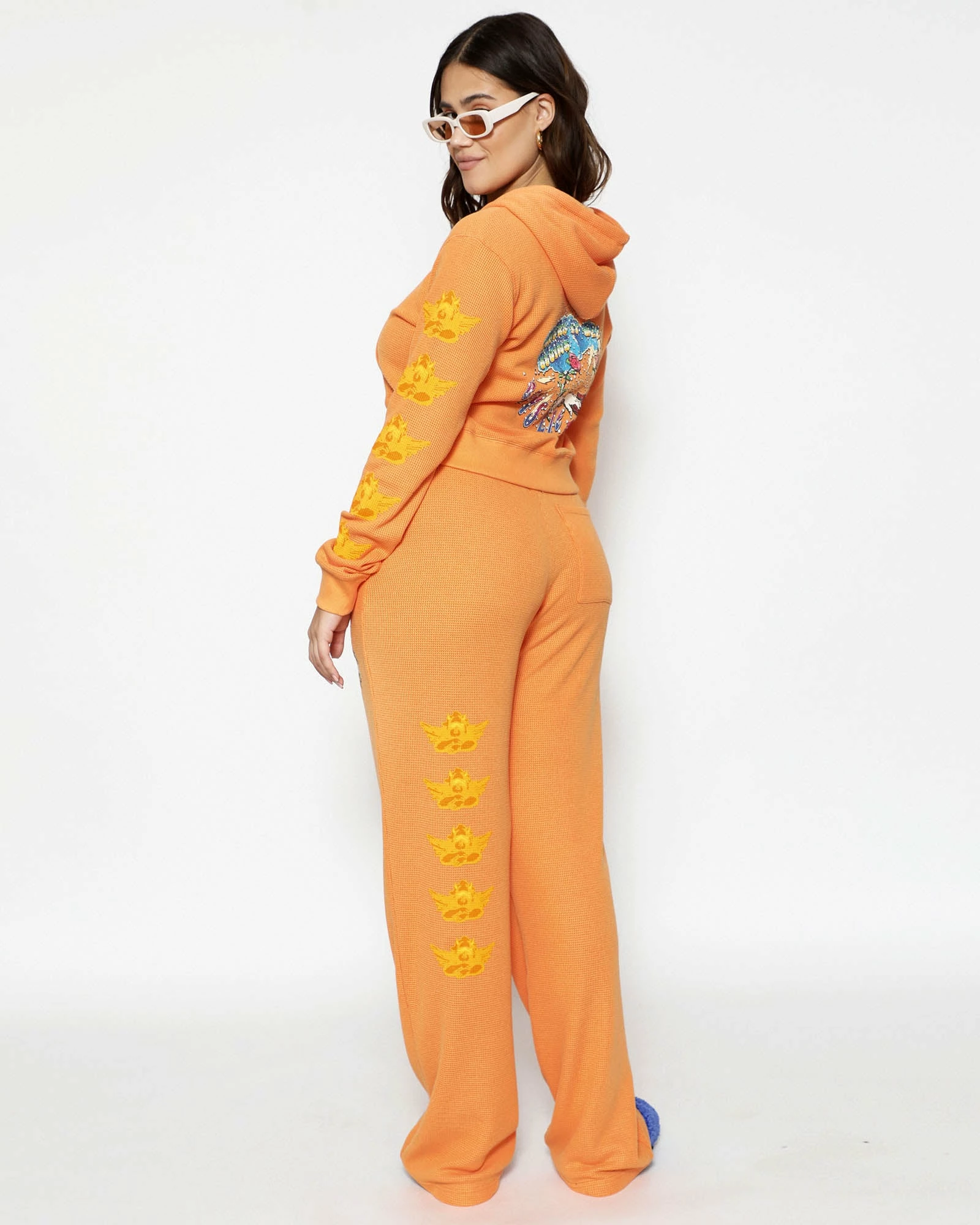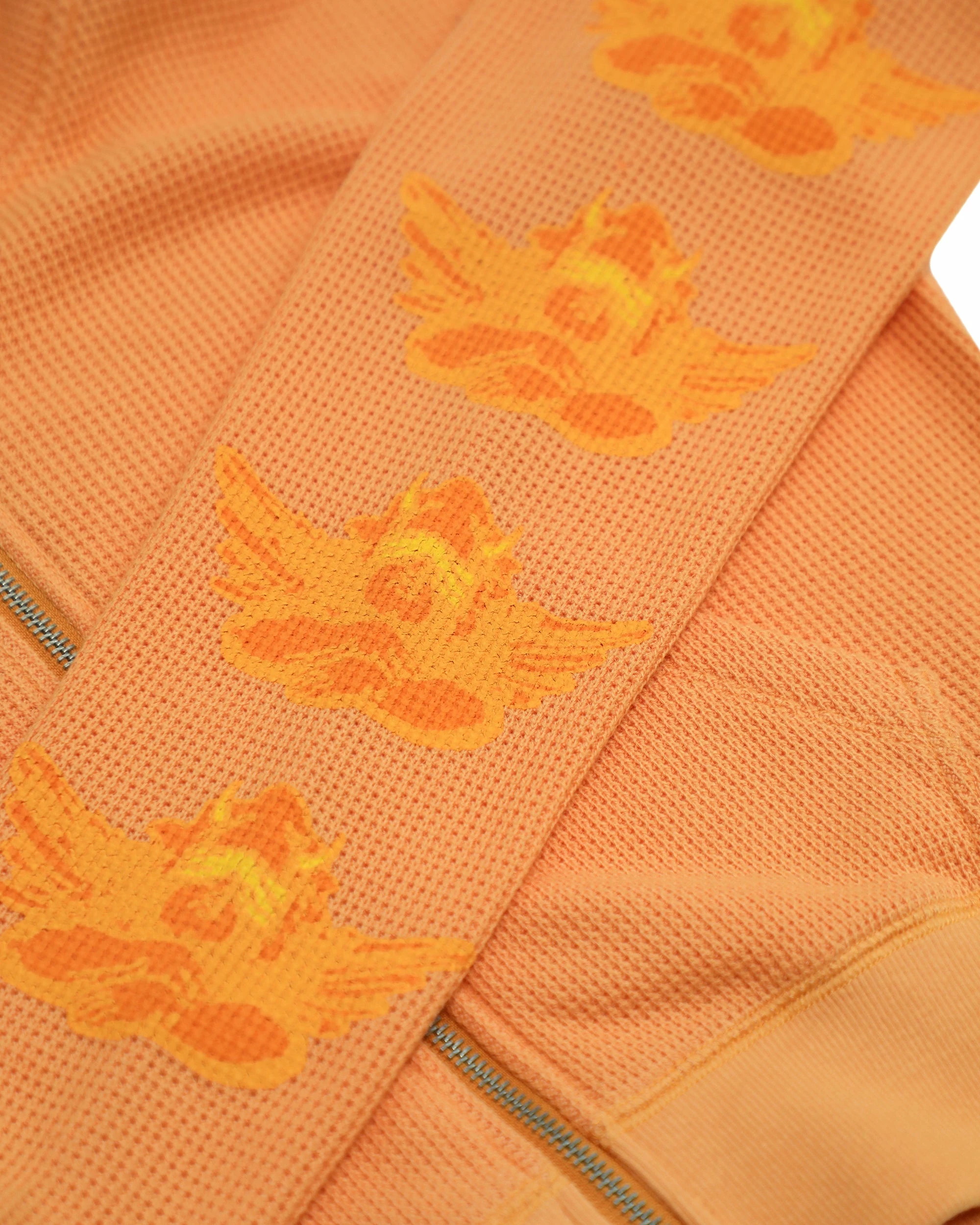 Super soft thermal fabric in bright orange. Zip up hoodie with cropped hem, front pockets, and ribbed cuffs.