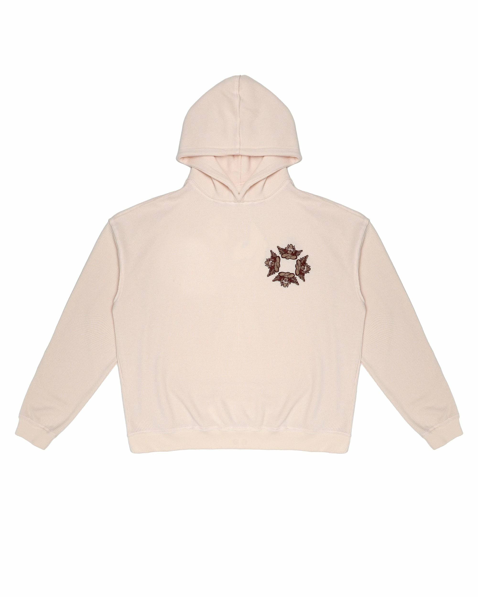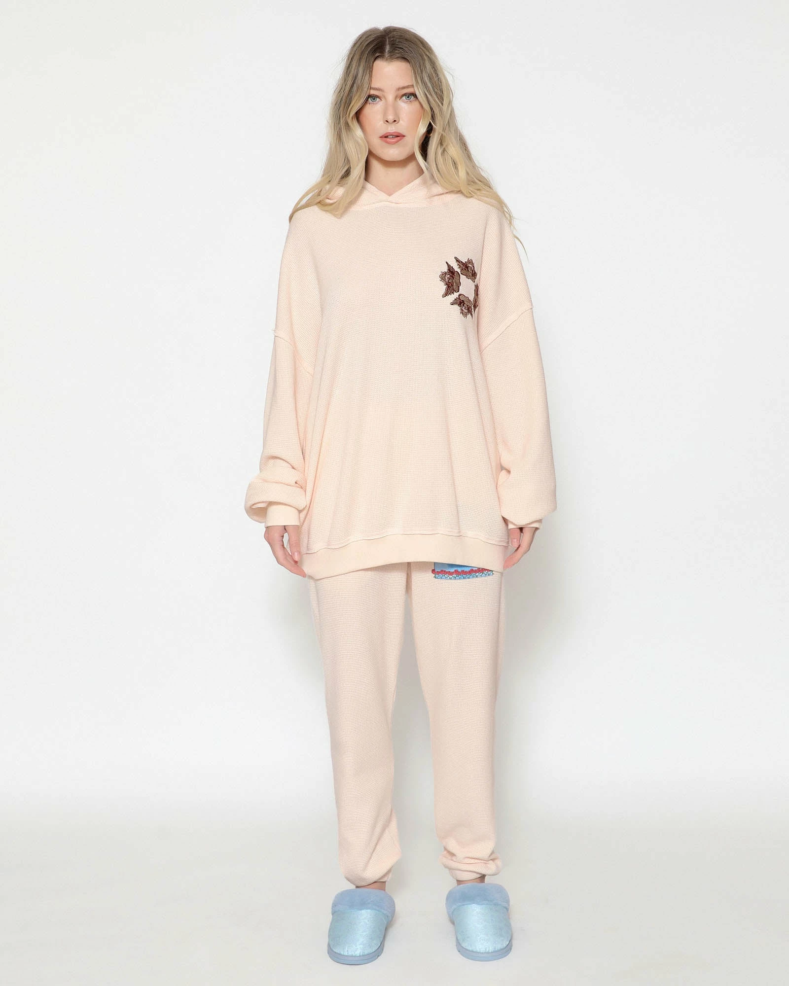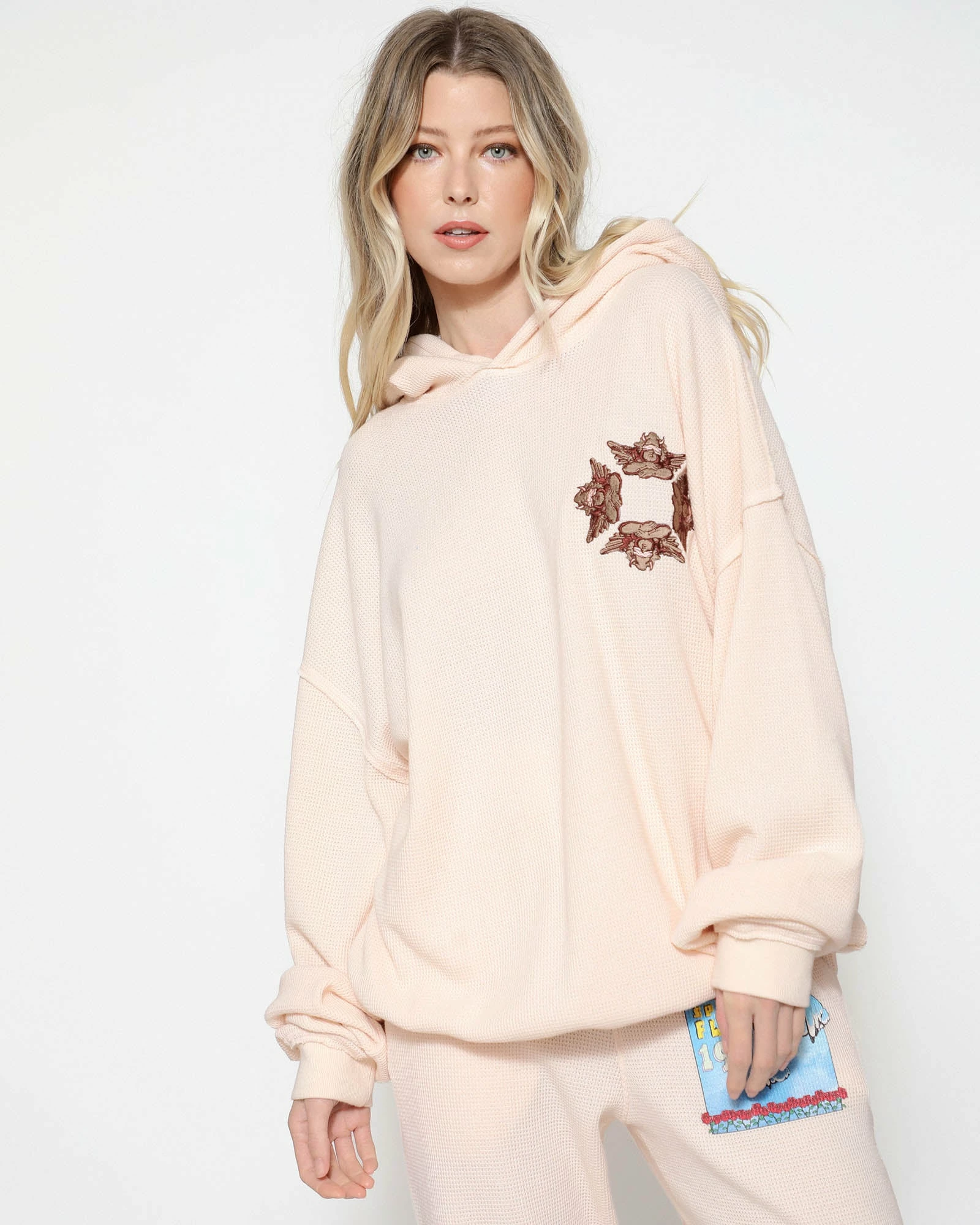 Super soft thermal hoodie in peach featuring exposed seams and a boyfriend fit. Embroidered front logos.