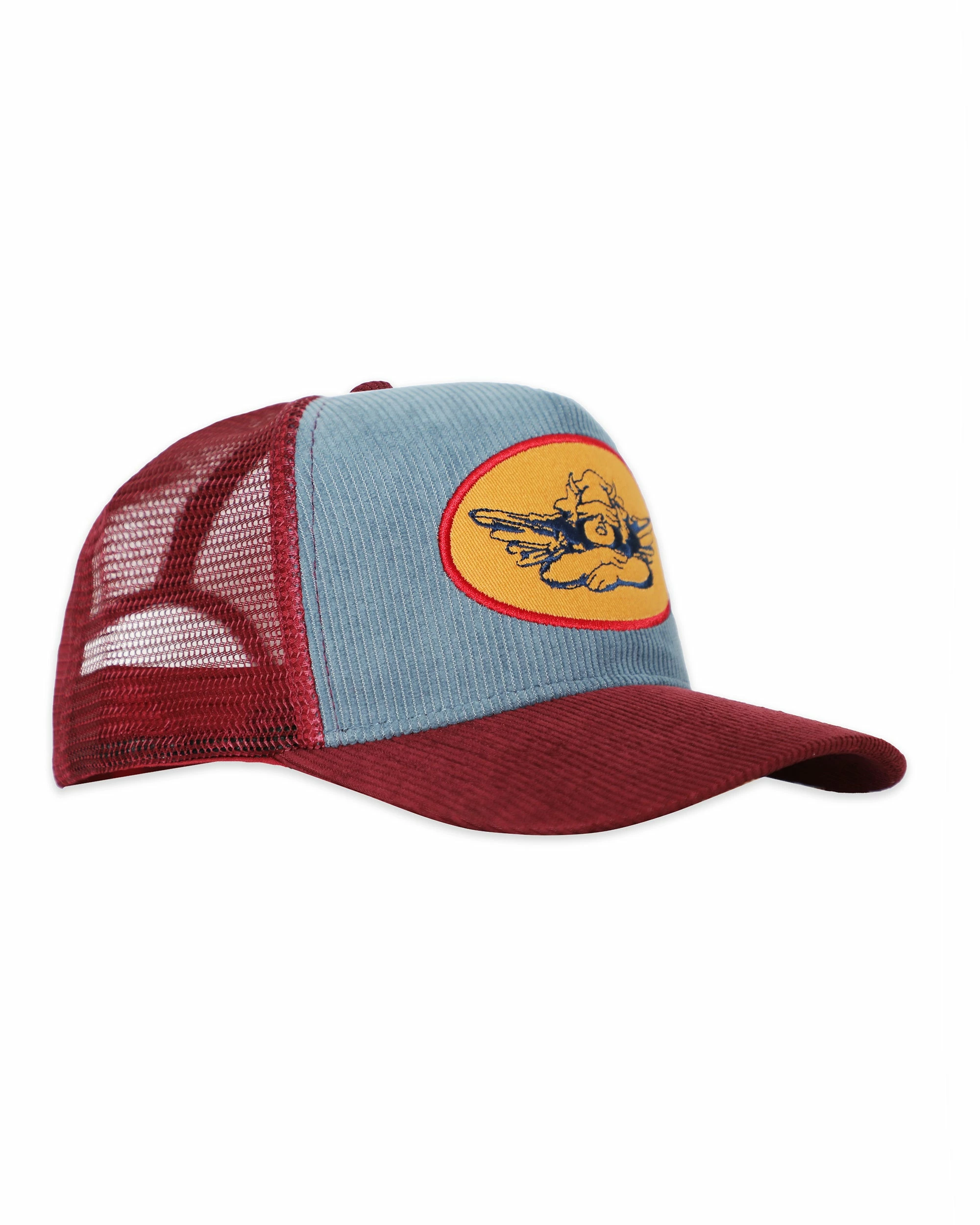 Maroon trucker hat with mustard yellow patch and blue corduroy. Adjustable snapback.